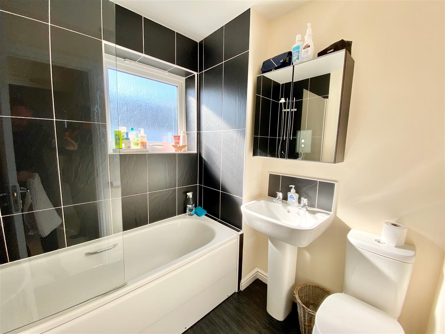 Family Bathroom - 1.98m x 2.49m (6'6 x 8'2) - White suite comprising bath with Mira shower system over and glass screen, wash handbasin and wc. Partly-tiled walls with a matching splash-back over the basin. Medicine cabinet with mirrored doors. Chrome towel rail/radiator.