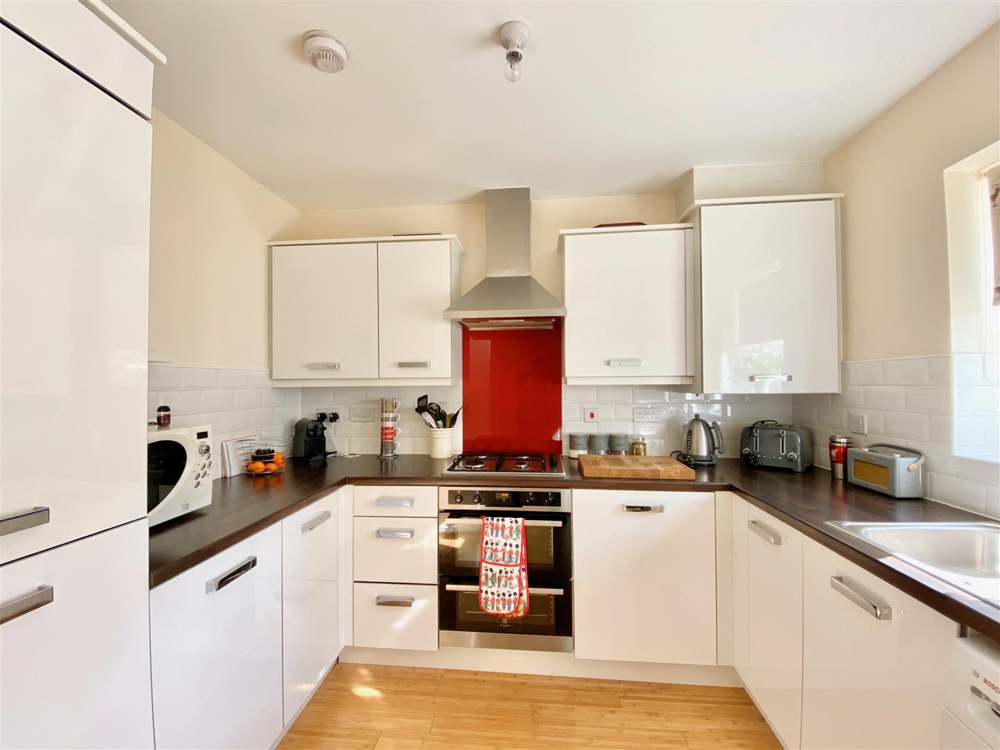 Kitchen - 2.90m x 2.26m (9'6 x 7'5) - Fitted with a range of modern cabinets with gloss fascias, contrasting work surfaces and tiled splash-backs. Built-in dual oven and grill. Inset hob with a glass splash-back and cooker hood above. Stainless-steel single-drainer sink unit. Space and plumbing for washing machine. Integral fridge and freezer. Window to the front elevation. Wall-mounted boiler concealed by a matching cabinet.