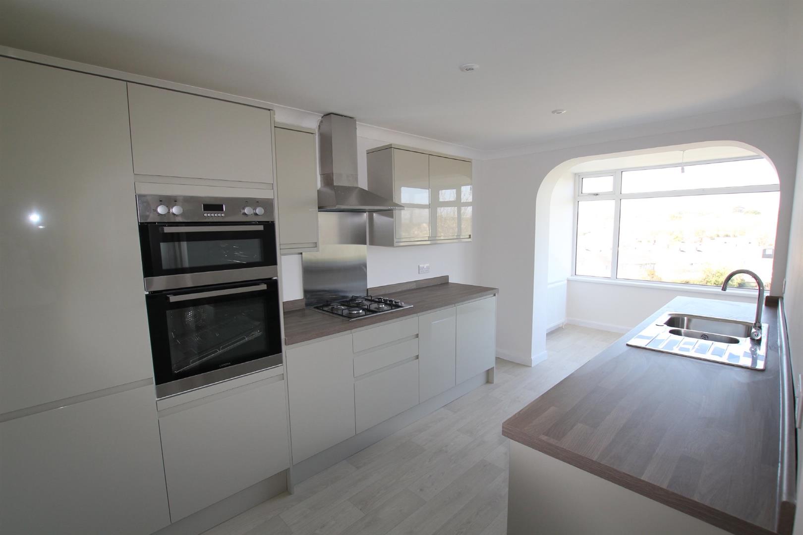 Kitchen/Diner - 20' 3" x 9' 11" at widest point (6.17m x 3.02m) - Contemporary matching eye-level and base units with work surfaces and inset 1? bowl single-drainer sink unit with mixer tap. Built-in 4 ring gas hob with extractor above and adjacent built-in double electric oven and grill. Space and plumbing for washing machine, dishwasher and fridge/freezer. Archway leading to the dining area. Double-glazed window and door to the rear providing a pleasant outlook over the local district and toward Plymouth and Dartmoor.