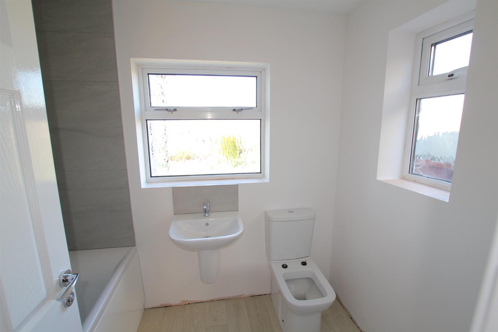 Bathroom - 5' 4" x 7' 7" (1.65m x 2.32m) - Fitted with a contemporary suite comprising with mixer tap, spray attachment, shower screen and fully-tiled area surround, sink unit with mixer tap and low-level toilet. Vertical towel rail/radiator. Obscured double-glazed windows to the side and rear elevations.