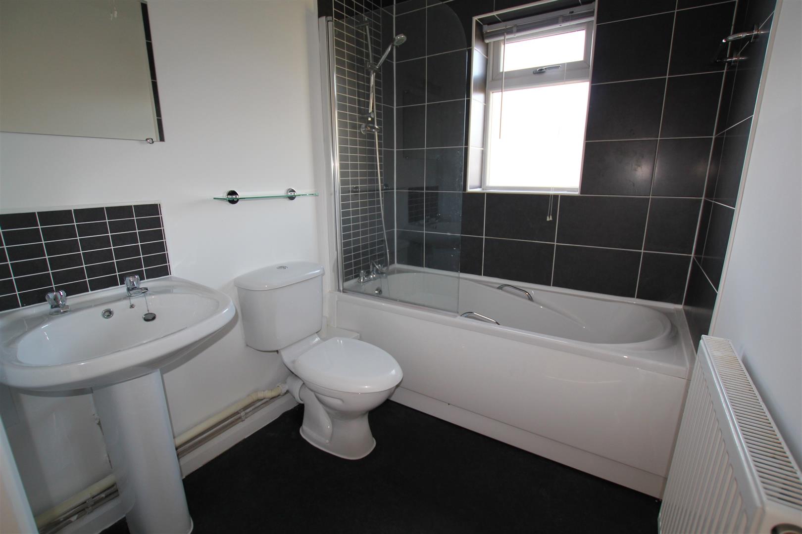 Bathroom - 2.20 x 1.72 (7'2" x 5'7") - Fitted with a white modern suite comprising panel bath with mixer tap, spray attachment, shower screen and tiled area surround pedestal wash handbasin and low-level wc. Obscured double-glazed window to the side. Built-in extractor fan.