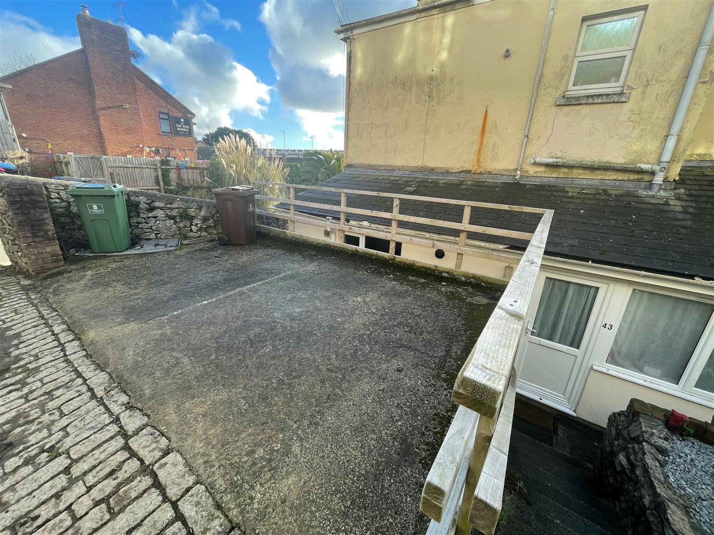 Outside - To the front of the building there is an allocated parking space and visitor parking. To the side of the building there is a communal garden area including the use of a washing line.