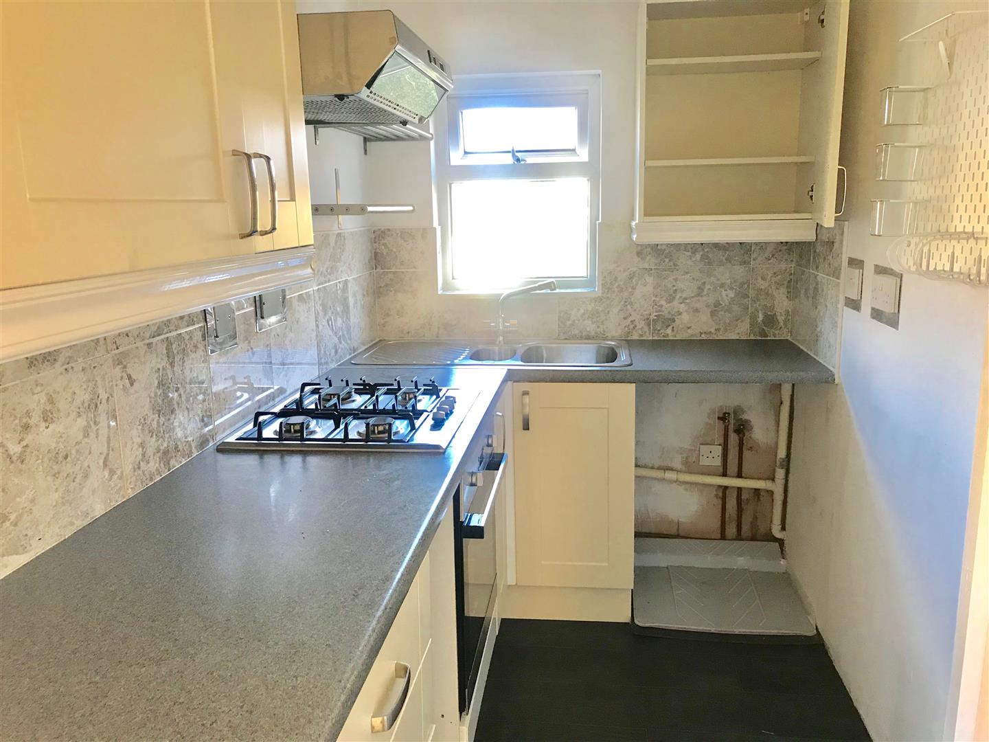 Kitchen - 2.97 x 1.61 (9'8" x 5'3") - Range of matching eye-level and base units with rolled-edge work surfaces and tiled splash-backs. Inset stainless-steel single drainer one-&-a-half bowl sink unit. Inset 4-ring gas hob with electric oven beneath. Space and plumbing for a washing machine. Please note that the free-standing fridge-freezer located in the alcove is included within the tenancy. Double-glazed window to the rear elevation. Folding door leading into the bathroom.
