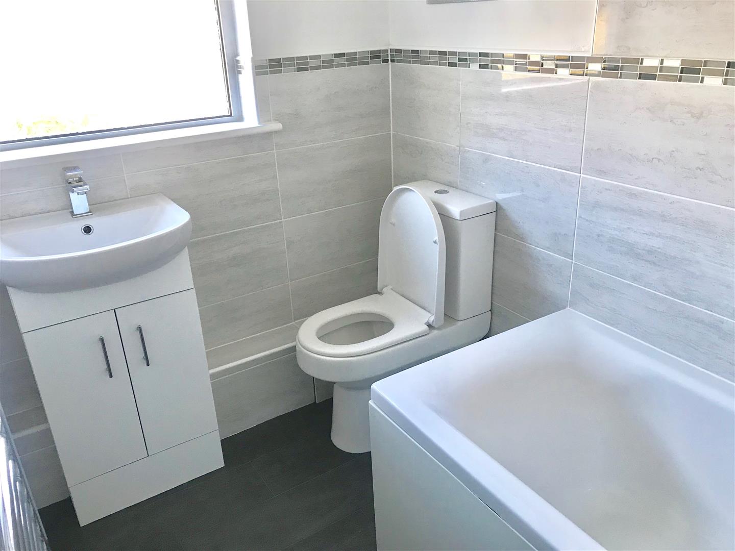 Bathroom - 2.57 x 1.51 (8'5" x 4'11") - White modern suite including a panel bath with shower screen and shower unit, low level wc and a sink unit with a cupboard beneath. Vertical towel rail/radiator. Window to the rear elevation.
