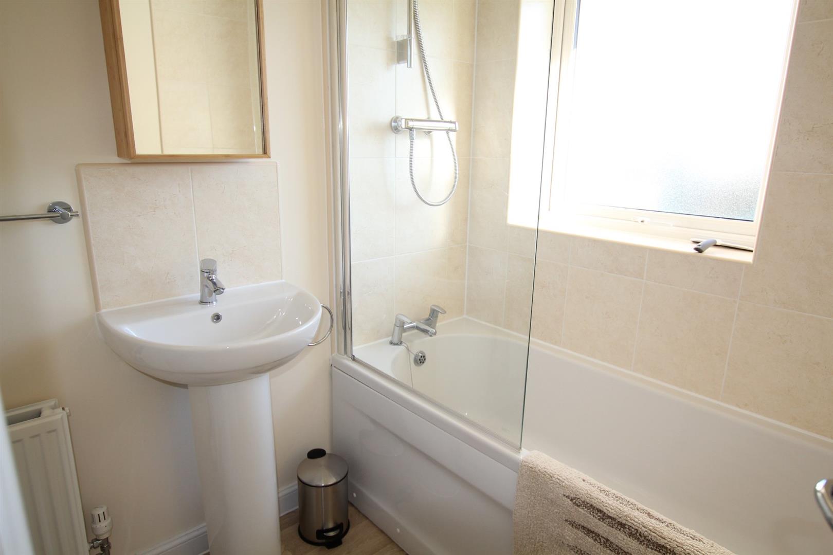 Bathroom - 7' 10" x 6' 3" (2.39m x 1.91m) - Fitted with a 3-piece white suite comprising panel bath with fully-tiled surround, mixer tap with direct-feed shower and shower screen, pedestal wash handbasin with mixer tap and tiled splash-back and low-level wc. Extractor fan. Obscured-glass uPVC double-glazed window.