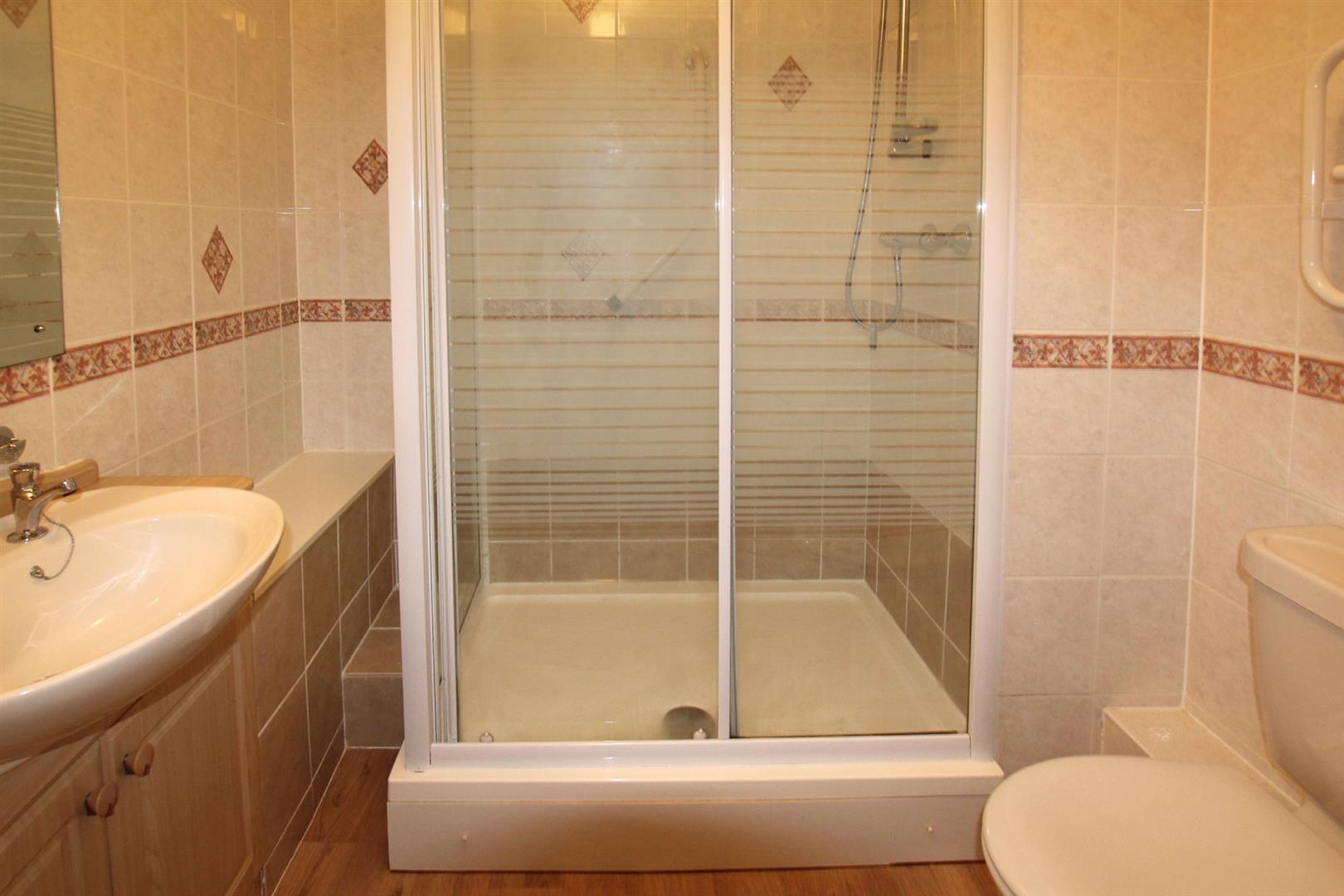 Shower Room - 0' 3" x 5' 6" (.08m x 1.70m) - Fully-tiled and fitted with a white modern suite comprising a sizeable walk-in shower including a wall-mounted shower unit and spray attachment, built-in vanity sink unit with cupboard below and low-level wc. Extractor fan. Wall-mounted electric heater and towel rail.