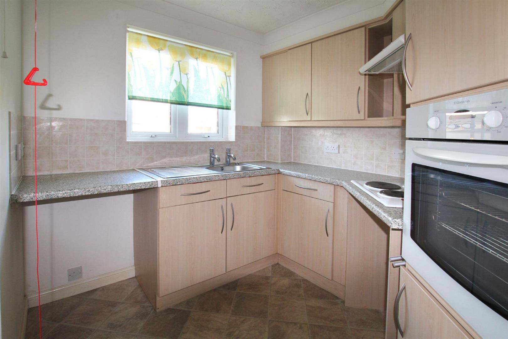 Kitchen - 7' 6" x 6' 11" at its widest points (2.30m x 2.12m - Double-glazed window overlooking the front. Range of beech-effect units comprising eye-level wall cupboards and matching base units with roll-edged work surfaces over, all with tiled splash-backs and incorporating a single-drainer sink unit. Built-in electric oven, hob and extractor fan. Space for under-counter refrigerator and freezer.