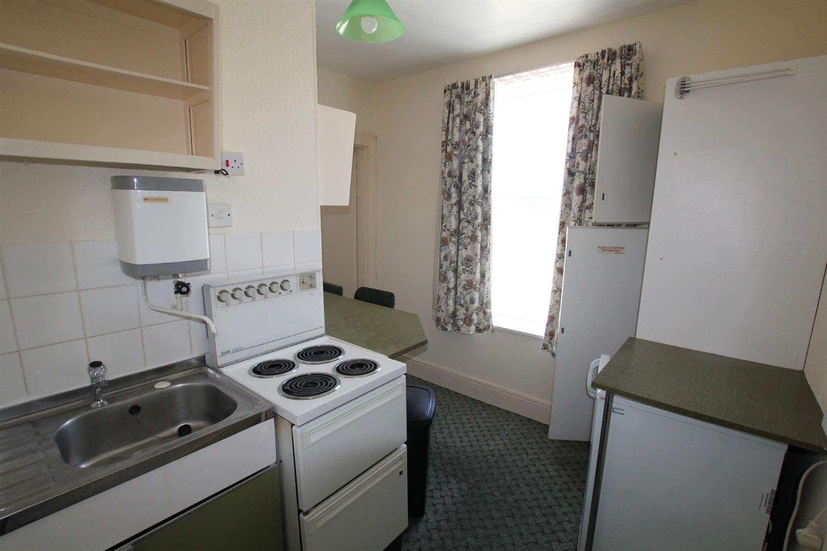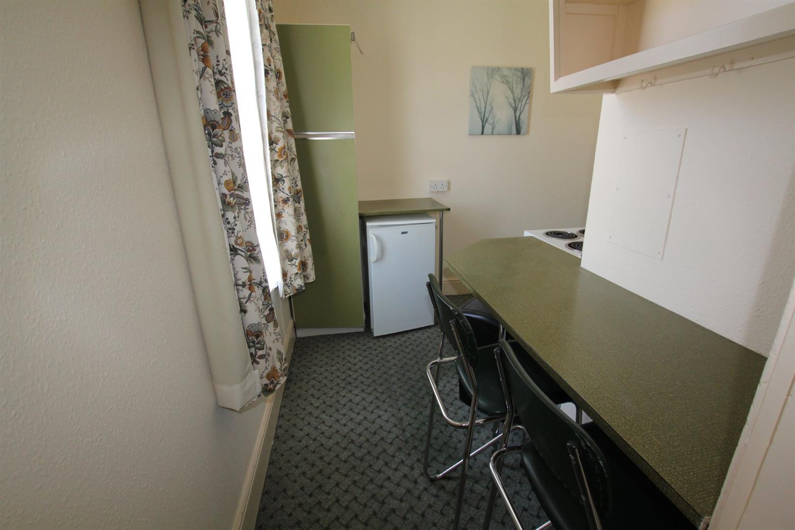 Kitchen/Seating Area - 9' 2" x 4' 4" (2.81m x 1.33m x 1.83m x 1.66m) - Inset sink unit with cupboard beneath and water heater above. Built-in breakfast bar/seating area. Range of storage cupboards. Free-standing fridge. Electric cooker. Double-glazed window to the rear. Door leading into the bedsitting room.