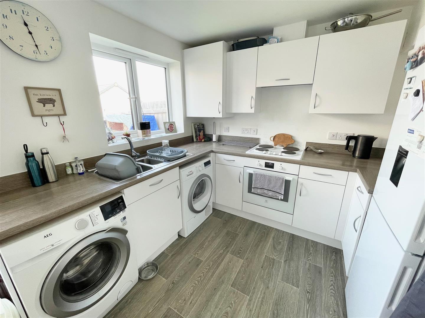 Kitchen/Dining Room - 4.64 x 2.70 incl kitchen units (15'2" x 8'10" incl - Series of white matching eye-level and base units with rolled-edge work surfaces. Inset stainless-steel single drainer one-&-half bowl sink unit with mixer tap. Built-in 4-ring electric hob with an electric oven beneath. Space and plumbing for washing machine. Space for tumble dryer. Space for fridge-freezer. Double-glazed window to the rear elevation. Door leading out to the garden.