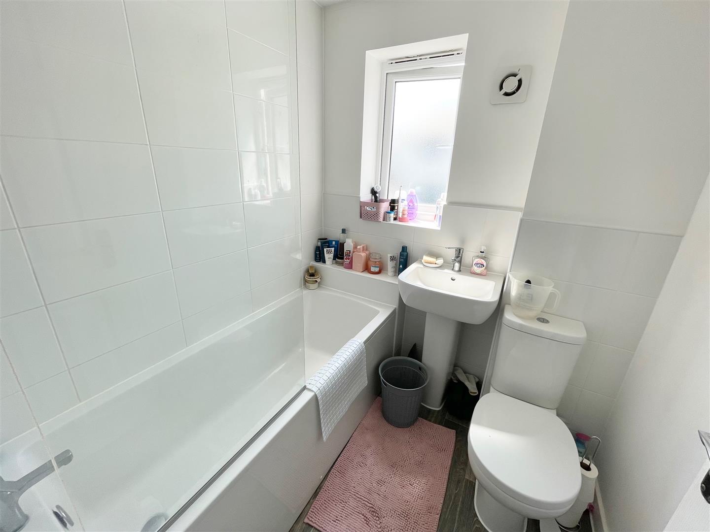 Bathroom - 1.79 x 1.82 (5'10" x 5'11") - White modern suite comprising a panel bath with mixer tap and shower screen, low level toilet and sink unit. Obscured double-glazed window to the side elevation.