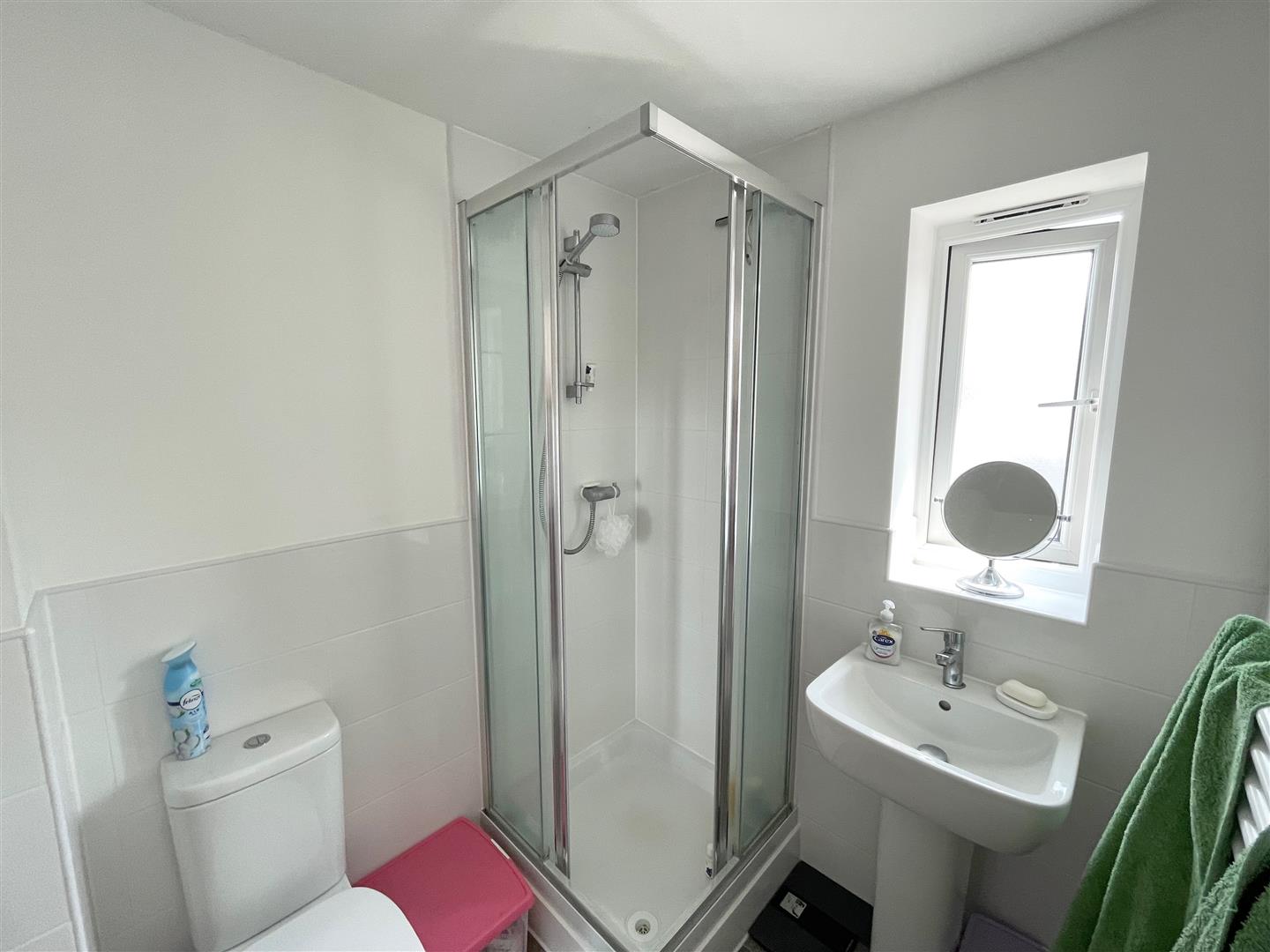 Ensuite Shower Room - 1.88 x 1.63 (6'2" x 5'4") - White modern suite comprising a corner shower cubicle with shower screen, shower unit and spray attachment, low level toilet and pedestal wash basin. Vertical towel rail/radiator. Double-glazed window to the front elevation.