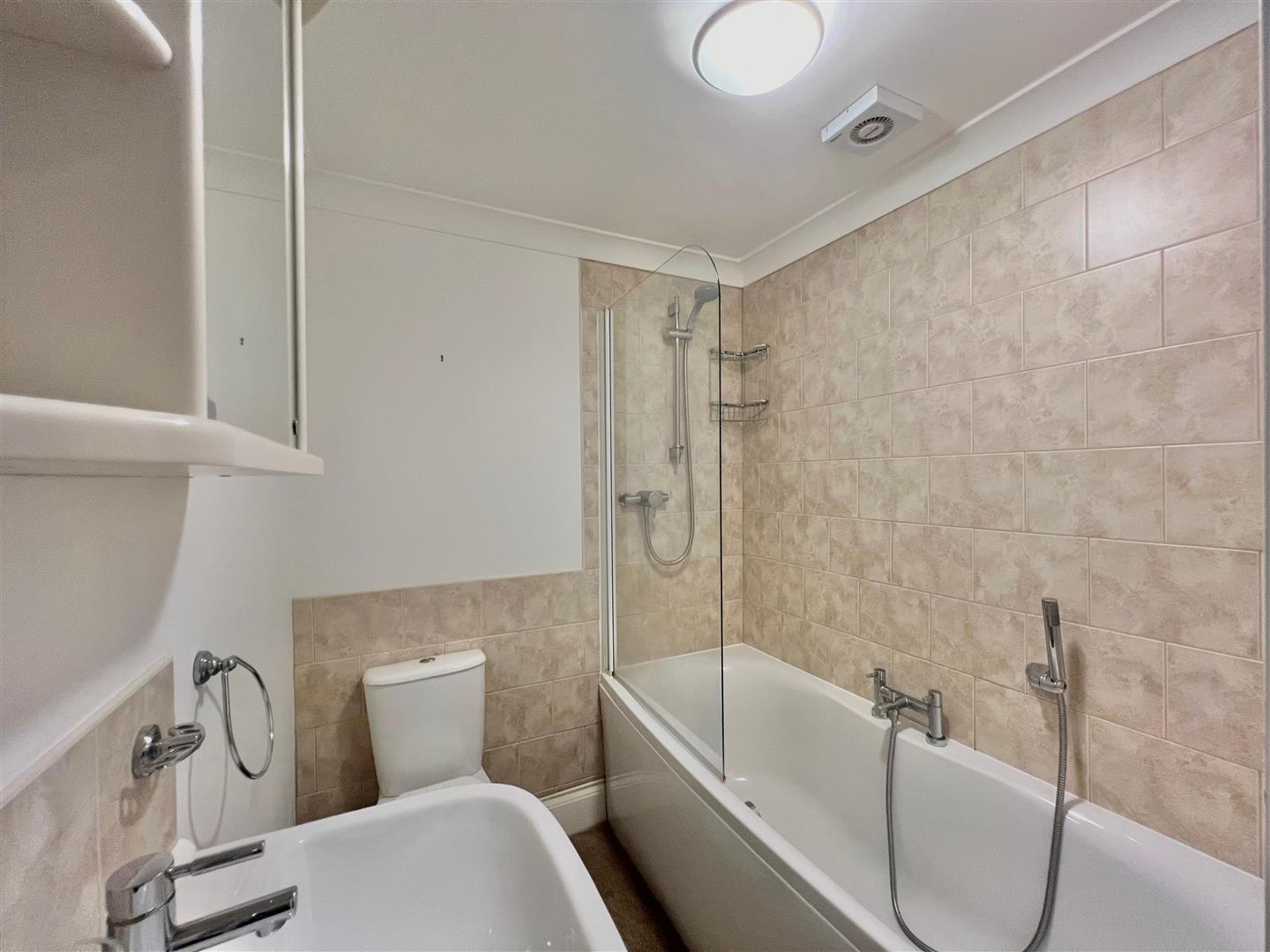 Bathroom - 2.46m x 1.70m (8'0" x 5'6") - White modern suite comprising a panel bath with mixer tap and spray attachment, separate shower unit with spray attachment and shower screen, pedestal wash basin with mixer tap and low level toilet. Vertical towel rail/radiator. Built-in linen cupboard with a radiator and slatted shelving.