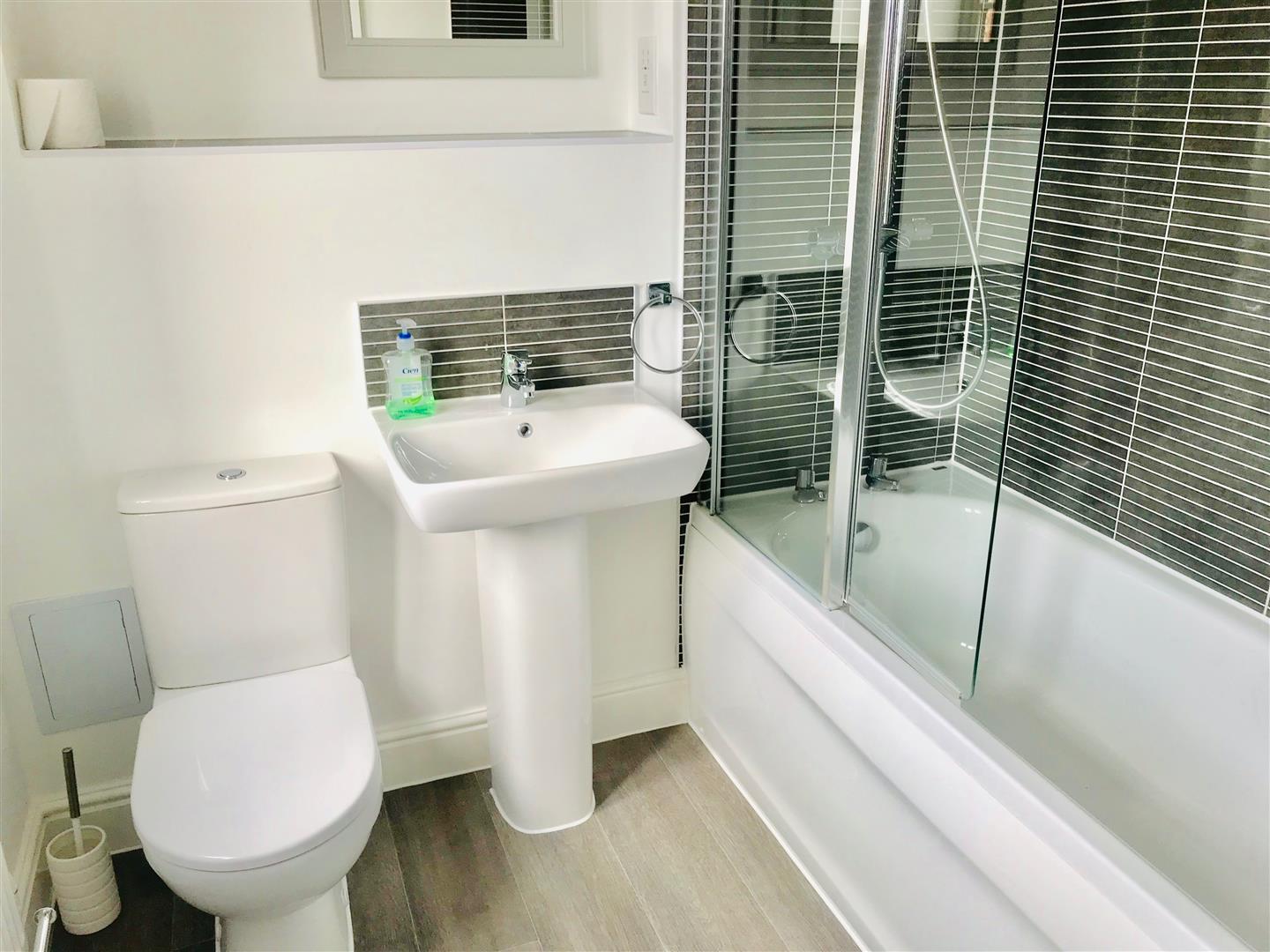 Bathroom - 2.05 x 1.68 (6'8" x 5'6") - Fitted with a white modern suite comprising a panel bath with a shower system over, tiled area surround and shower screen, pedestal wash hand basin with mixer tap and tiled splash-back and a wc.