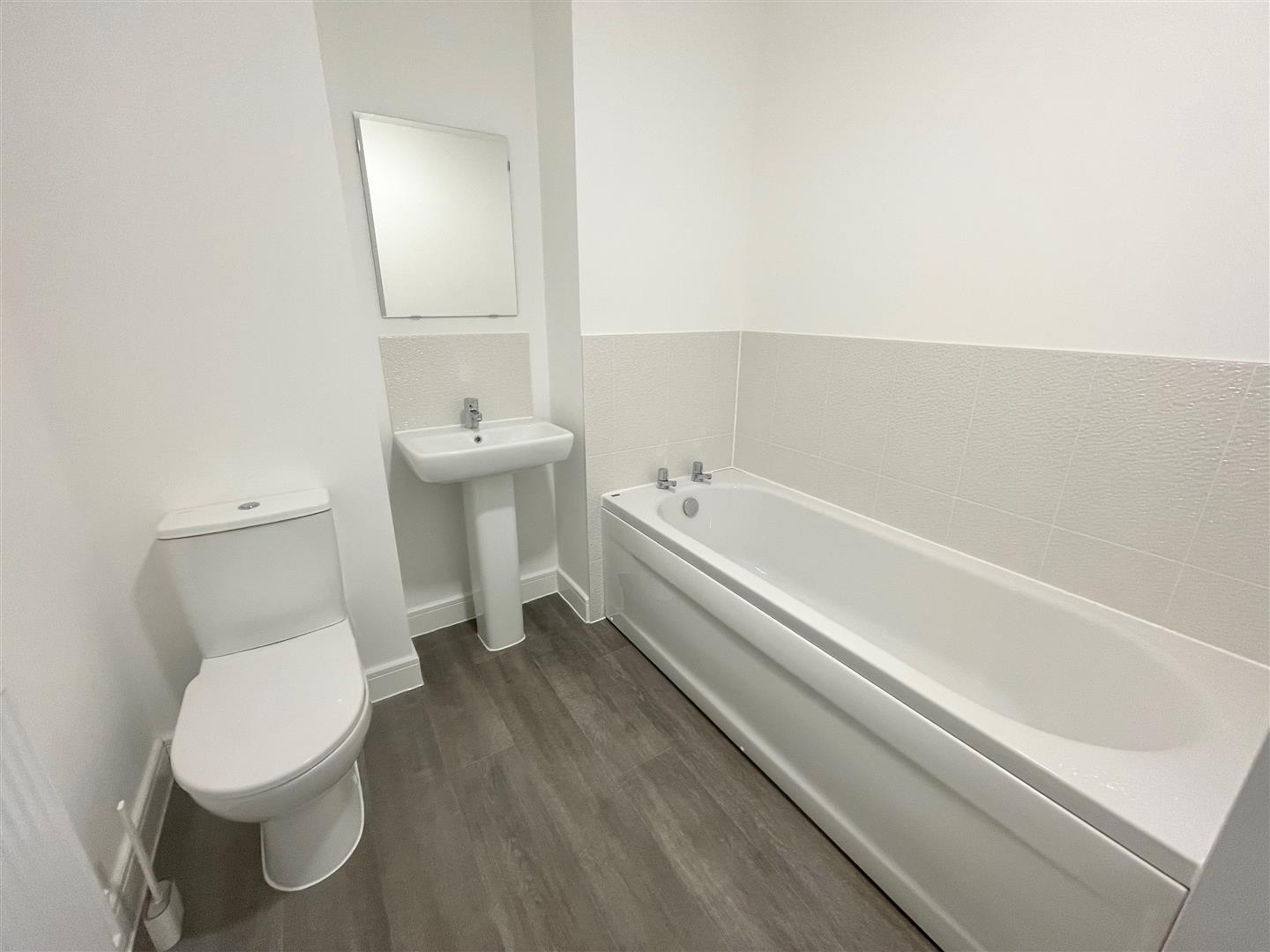 Bathroom - 3.13 at widest point x 2.14 (10'3" at widest point - White modern suite comprising a panel bath with tiled area surround, low level toilet and pedestal wash basin.