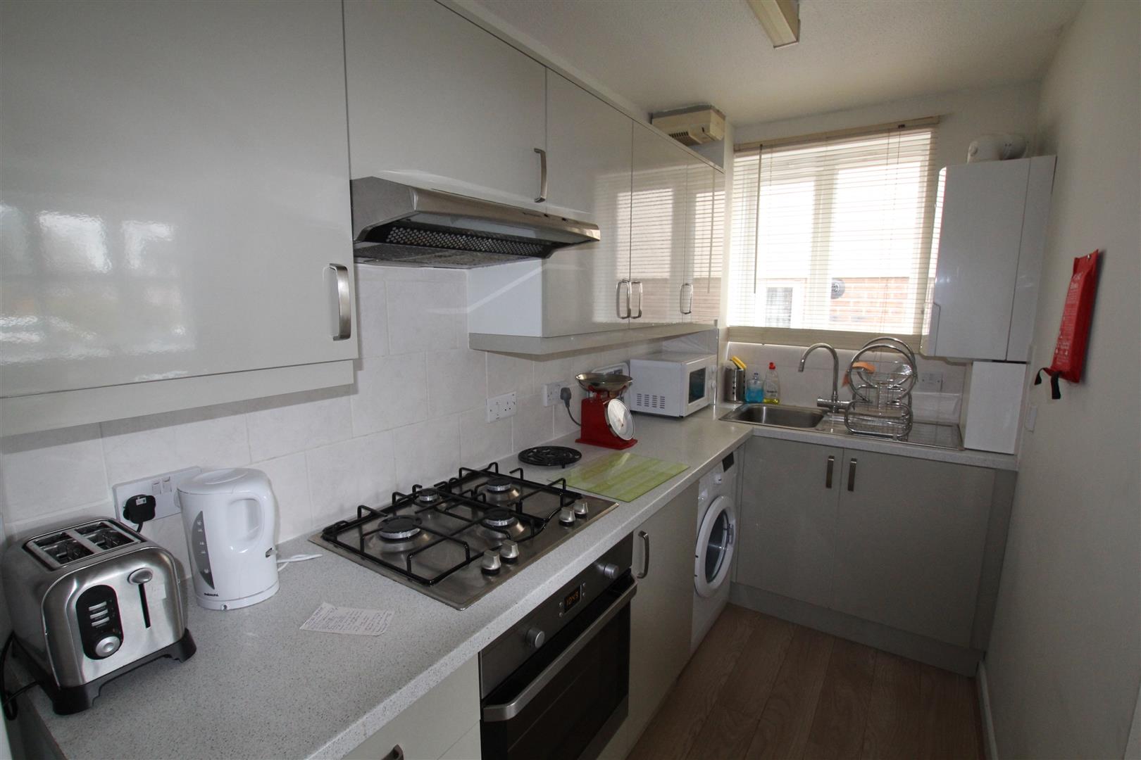 Kitchen - 3.43 x 1.53 inc units (11'3" x 5'0" inc units) - Series of modernised matching eye-level and base units with tiled splash-backs and roll-edged work surfaces. Inset single-drainer single-bowl sink unit with mixer tap. Built-in 4-ring gas hob with electric oven beneath. Space and plumbing for washing machine (with washing machine in situ). Space for fridge/freezer (with fridge/freezer in situ). Under-stairs storage cupboard. Double-glazed window to the side. Number of kitchen appliances and utensils.