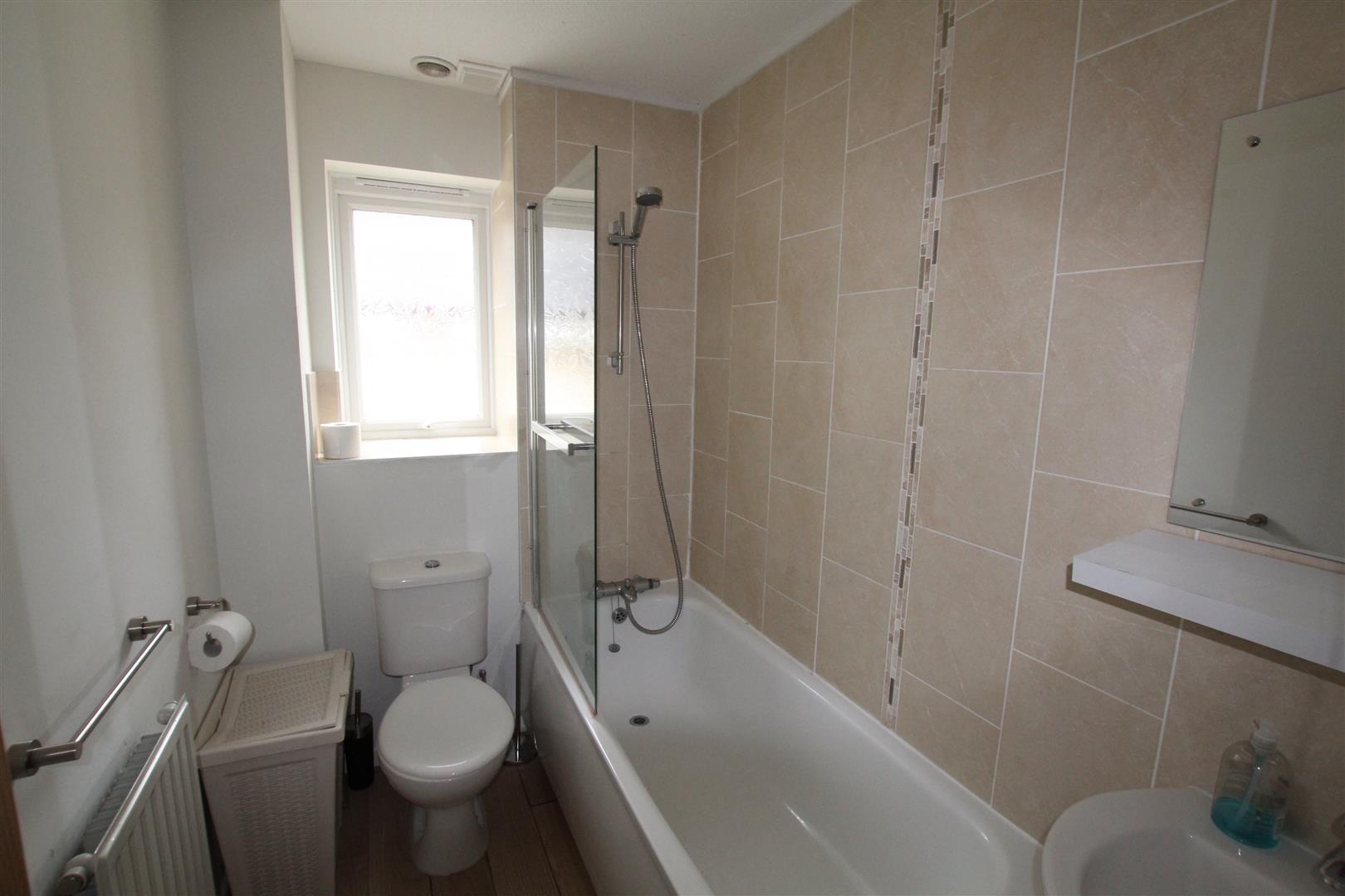 Bathroom - 2.31 x 1.56 (7'6" x 5'1") - Fitted with a white modern suite comprising panel bath with mixer tap, spray attachment and shower screen, pedestal wash handbasin with mixer tap and low-level toilet. Obscured double-glazed window to the side.