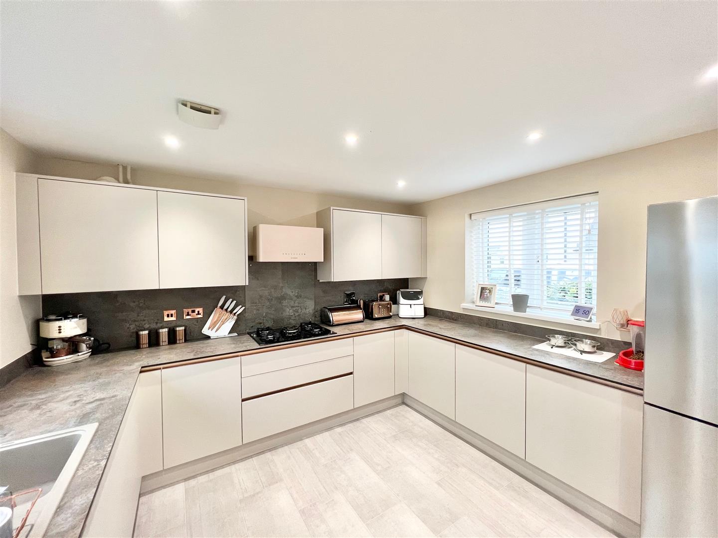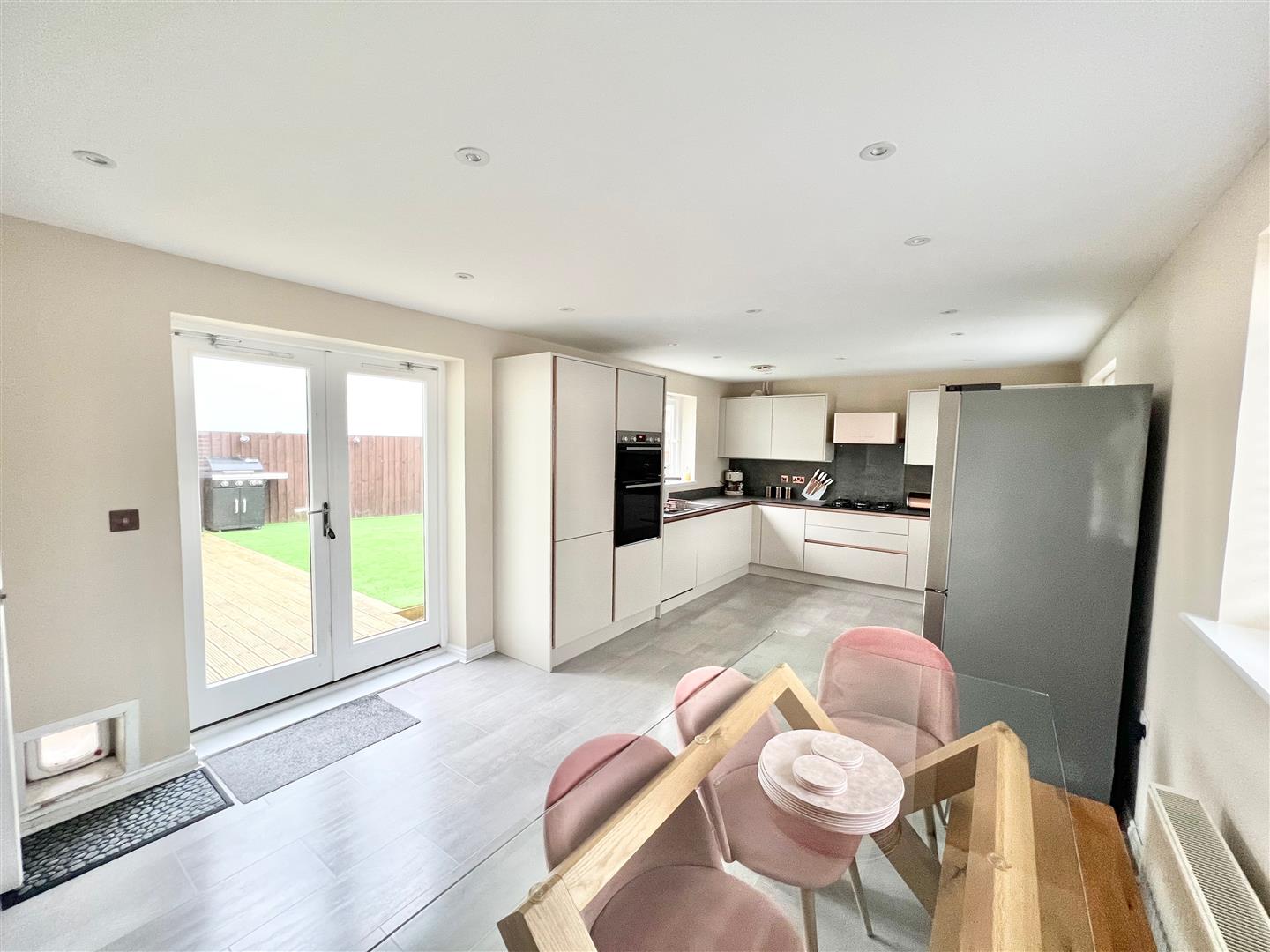 Kitchen/Breakfast/Family Room - 6.80 x 3.42 inc units (22'3" x 11'2" inc units) - Fabulous, contemporary kitchen fitted with a range of matching eye-level and base units and complementary work surfaces. Inset 5-ring gas hob with extractor hood above. Built-in appliances include an electric double oven and grill, integrated dishwasher and washing machine. Windows to both side elevations. Double doors leading to the rear garden.