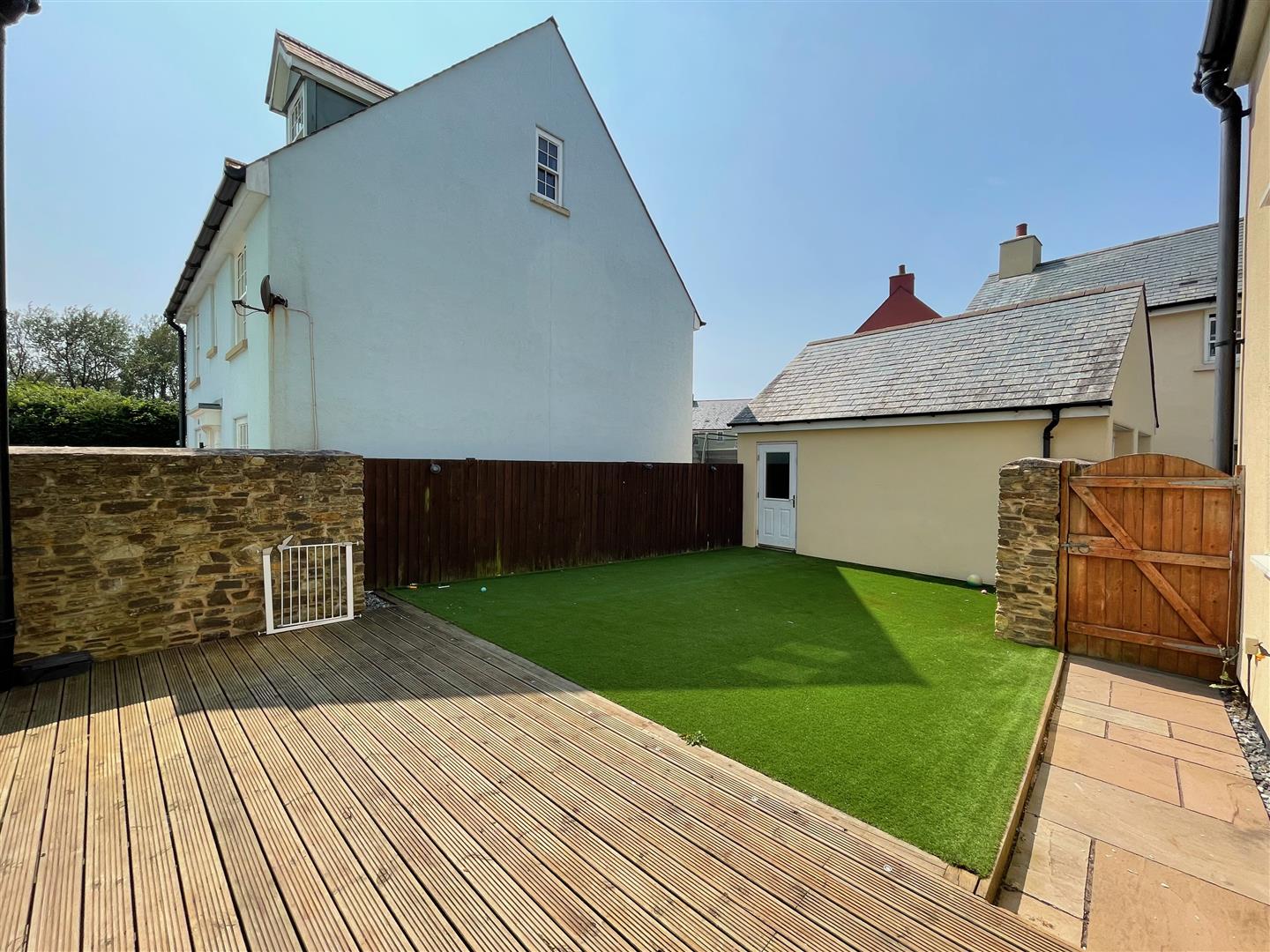 Outside - To the rear of the property there is a level, garden enclosed by fencing and walling including a sizeable area of decking and a pathway leading to a gate together with an area laid to artificial grass. Courtesy door leading to the side of the garage. Outside light. Outside power point. Outside cold water tap.