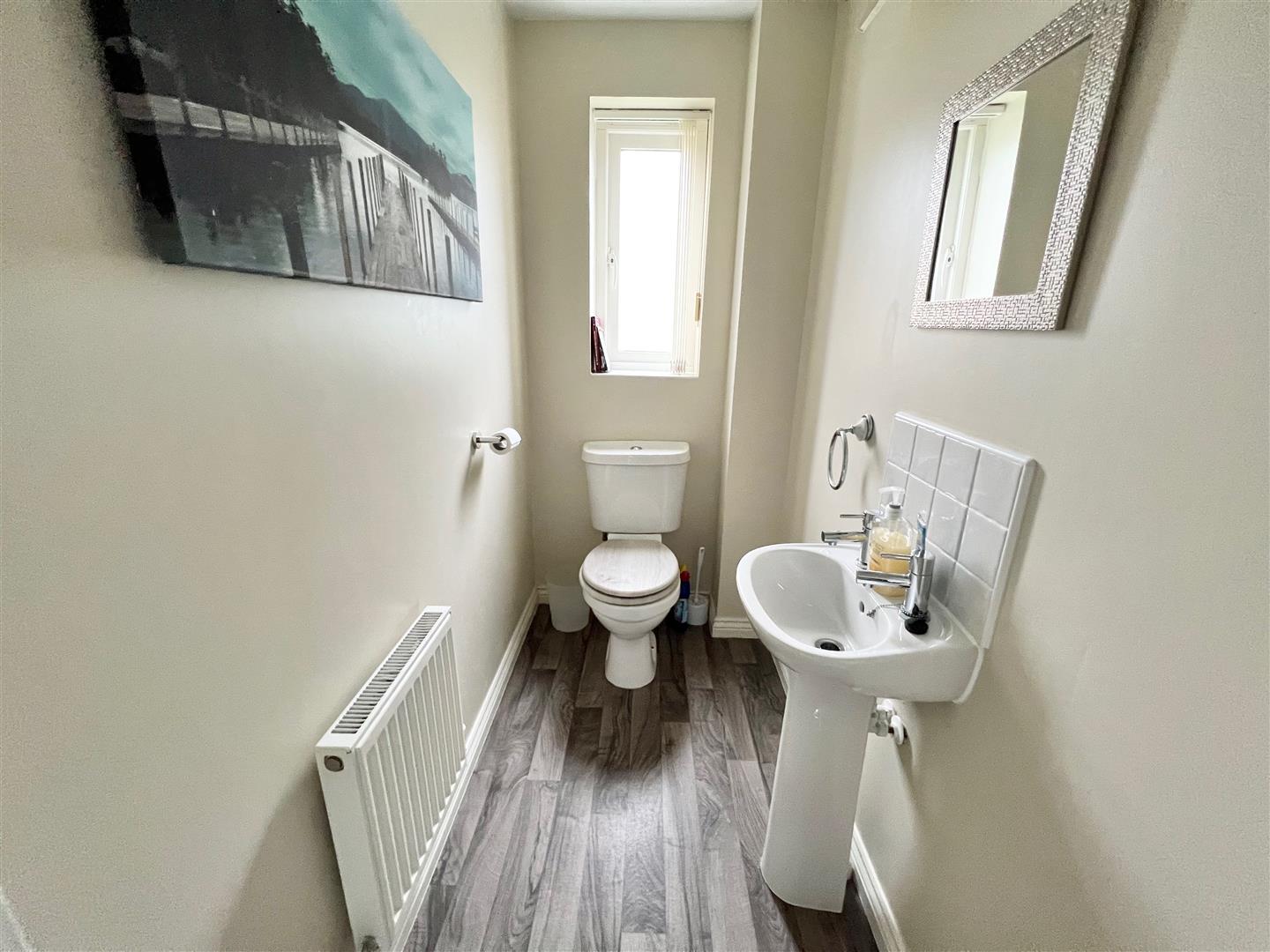 Downstairs Cloakroom - 1.93 x 1.06 (6'3" x 3'5") - Fitted with a low-level toilet and pedestal wash handbasin. Built-in extractor. Obscured double-glazed window to the side elevation.