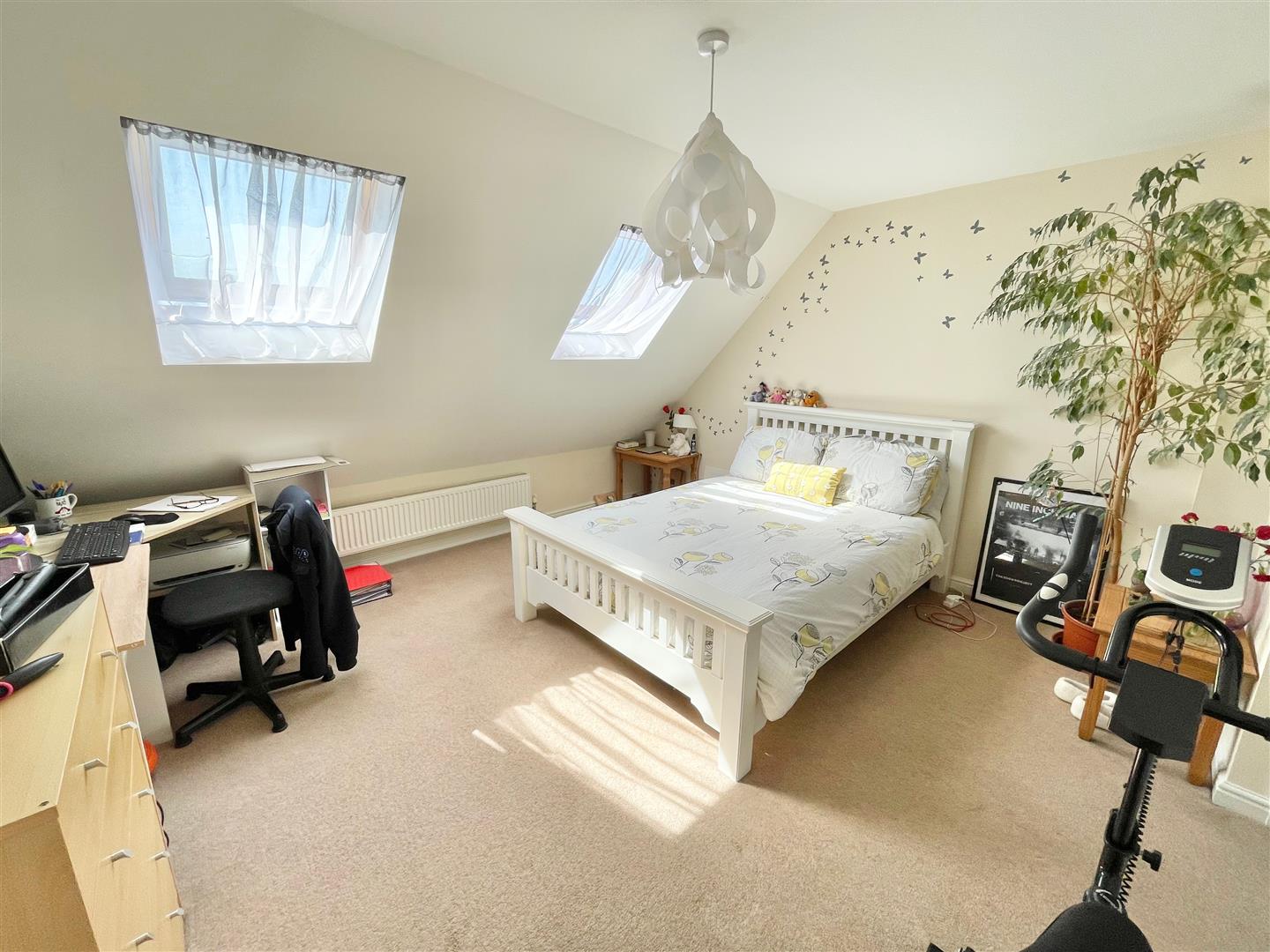 Bedroom One - 3.94 x 3.15 at a height of 1.5 (12'11" x 10'4" at - Sloping ceiling to the rear elevation. 2 Velux roof windows. Built-in storage cupboard. Open shelving and hanging rail providing useful storage area. Loft hatch. Door opening to the ensuite shower room.