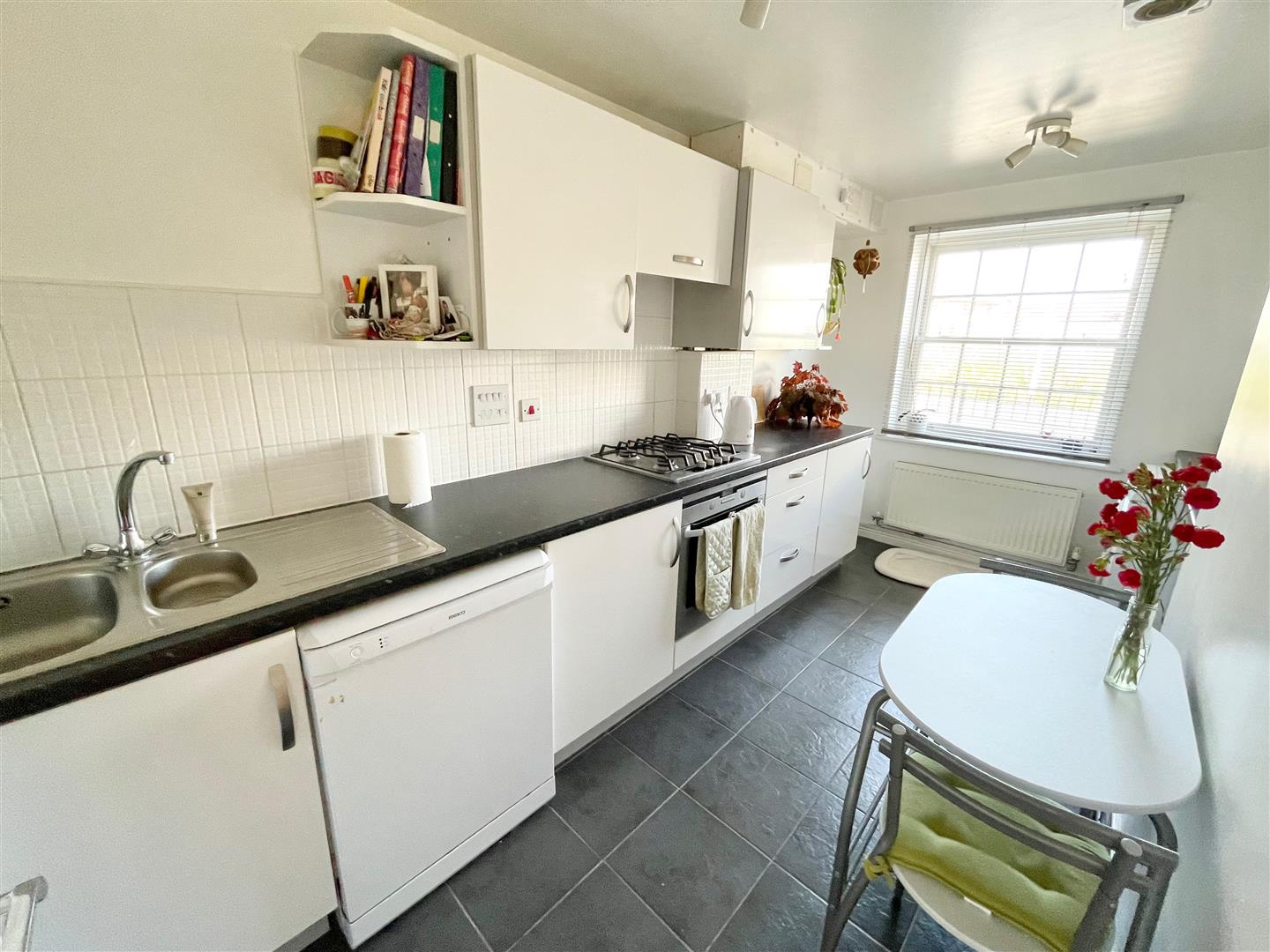 Kitchen/Breakfast Room - 4.85 x 1.89 excl widest point (15'10" x 6'2" excl - Series of white matching eye-level and base units with rolled-edge work surfaces and tiled splash-backs. Inset stainless-steel single drainer one-&-a-half bowl sink unit with mixer tap. Built-in 4-ring gas hob with an electric oven beneath. Space and plumbing for washing machine. Space for fridge-freezer. Suitable space and plumbing for dishwasher. Cupboard concealing the gas boiler.