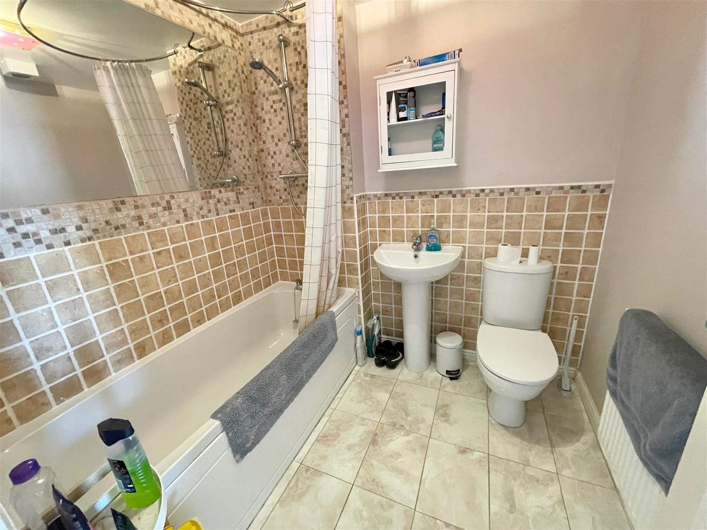 Bathroom - 2.06 x 1.91 (6'9" x 6'3") - White modern suite comprising a panel bath with a shower unit and spray attachment over and tiled area surround, a low level wc and a pedestal wash basin with mixer tap. Tiled floor.