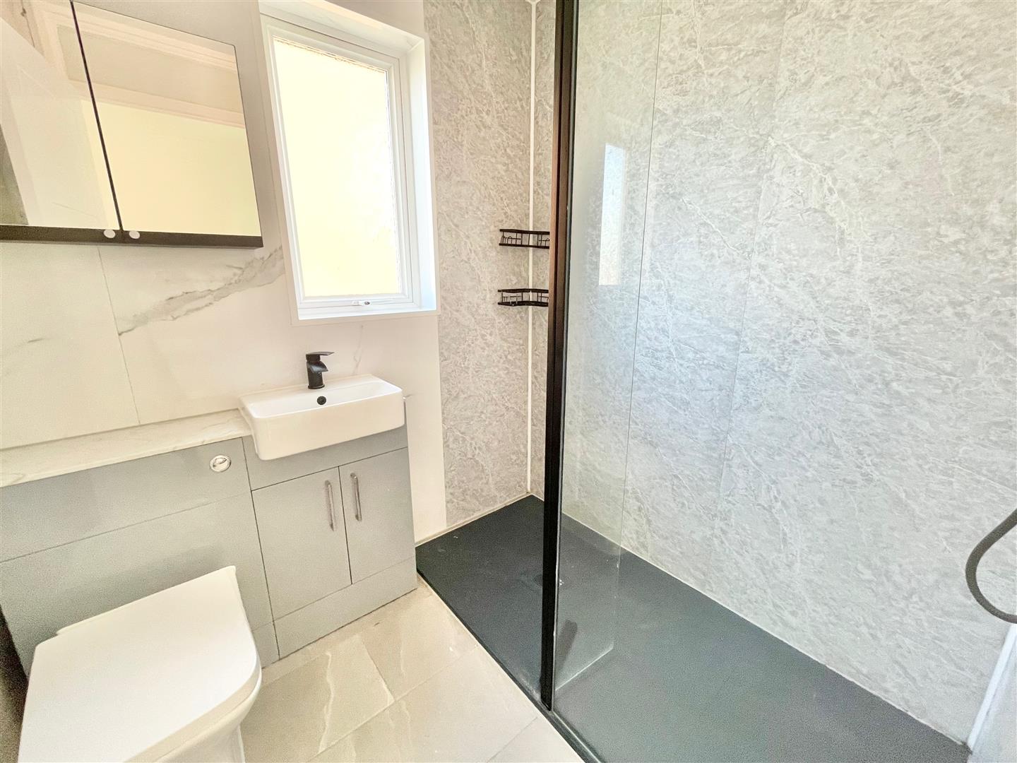 Shower Room - 1.87 x 1.71 (6'1" x 5'7") - White modern suite comprising a walk-in shower cubicle, sink unit and a low level wc with a boxed-in cistern. Vertical towel rail/radiator. Double-glazed window to the side elevation.