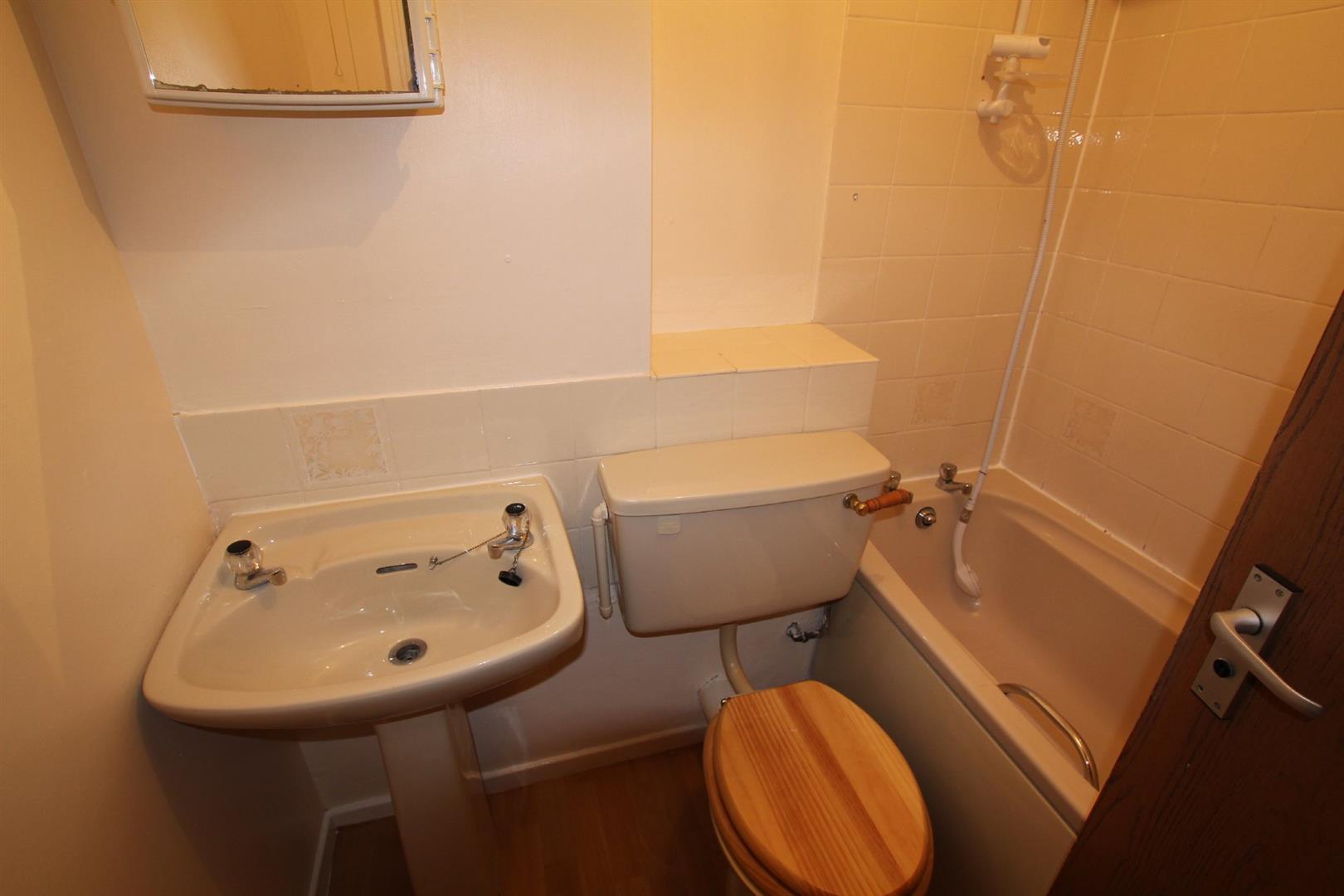 Bathroom - 5' 6" x 6' 2" (1.70m x 1.88m) - Coloured suite comprising panel bath with shower unit, spray attachment and tiled area surround, pedestal wash handbasin and low-level wc. Built-in extractor fan.