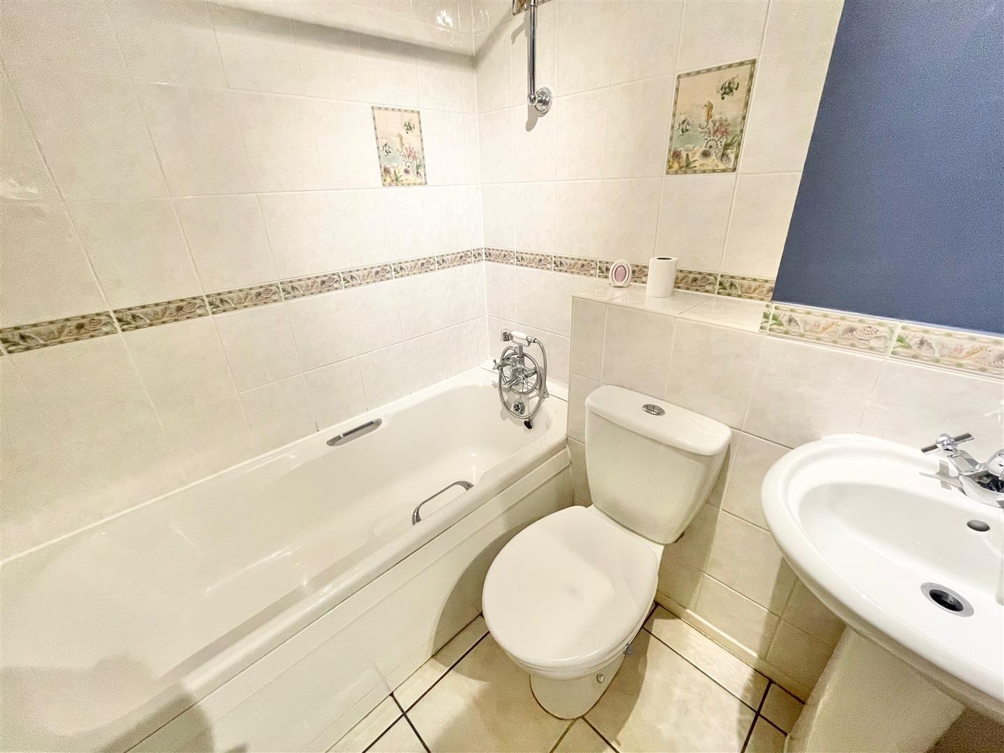 Bathroom - 1.89 x 1.68 (6'2" x 5'6") - White modern suite including pedestal wash basin, low level toilet and panel bath with tiled-area surround, handgrips and a mixer tap with a spray attachment. Tiled floor.