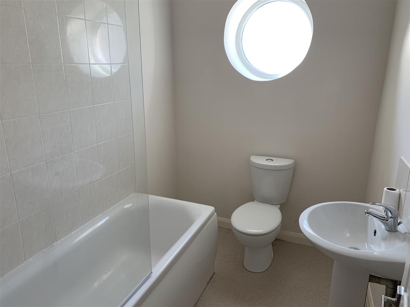 Bathroom - 2.34m x 1.70m (7'8 x 5'7) - White, modern suite comprising bath, wc and pedestal wash handbasin. Partly-tiled walls. Electric shower system over the bath with a glass screen. Feature porthole-style window.
