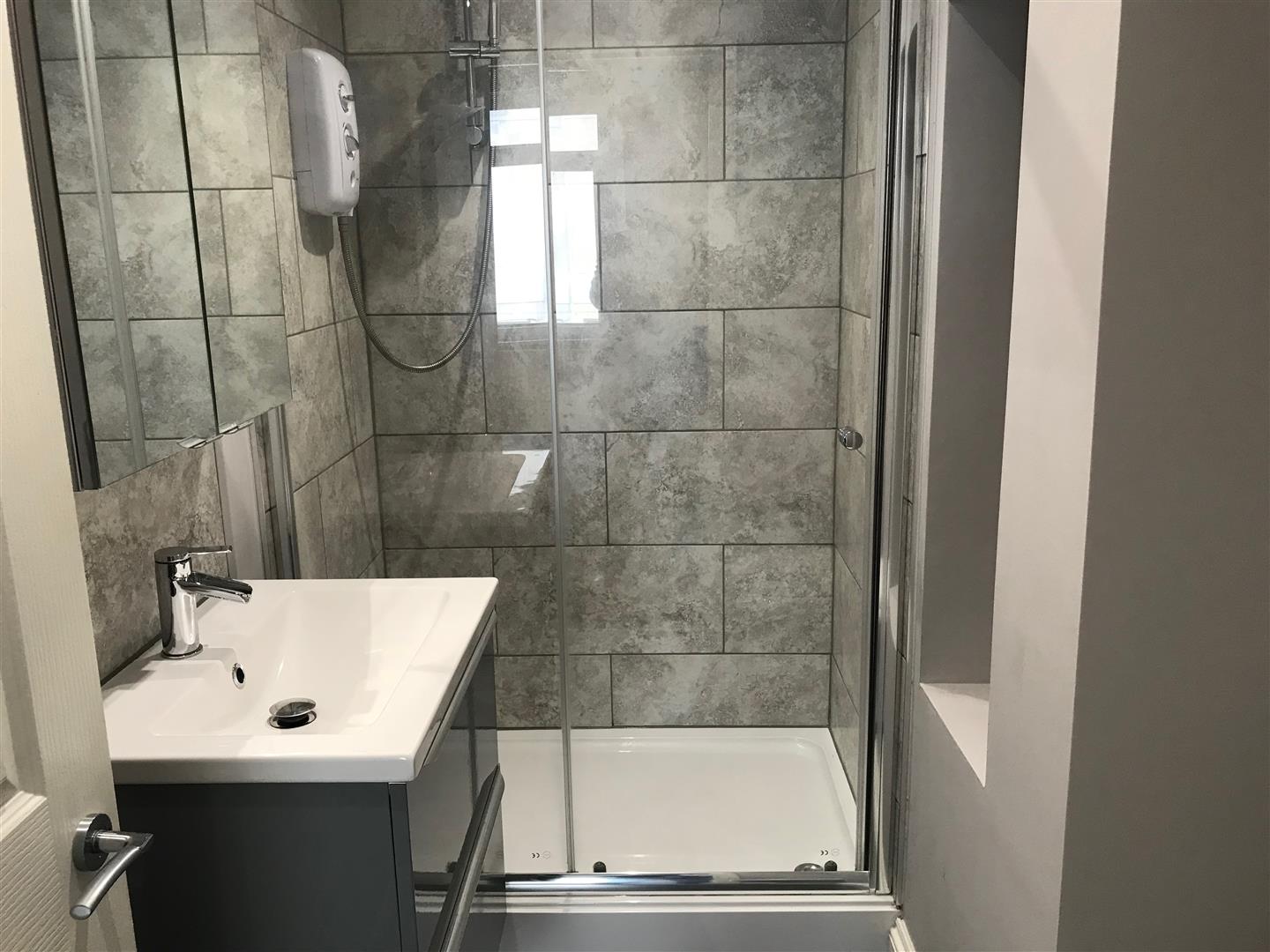 Family Bathroom - 2.66 x 2.38 at widest points (8'8" x 7'9" at wides - An irregular shaped room narrow to a point at the far end where the gas boiler is located. Fitted with a low level toilet, a sink unit with a cupboard beneath and a mirror fronted unit above and a Quadrant-style shower with tiled area surround and a shower unit with a spray attachment and a bath with mixer tap and tiled area surround. Double-glazed window to the rear elevation.