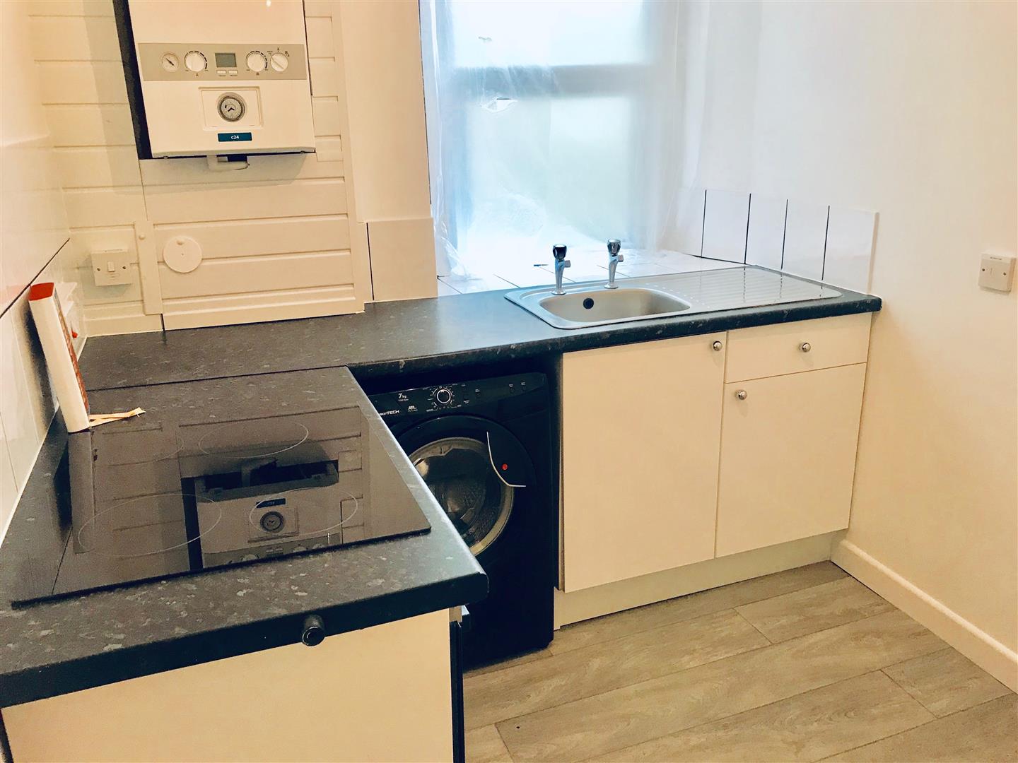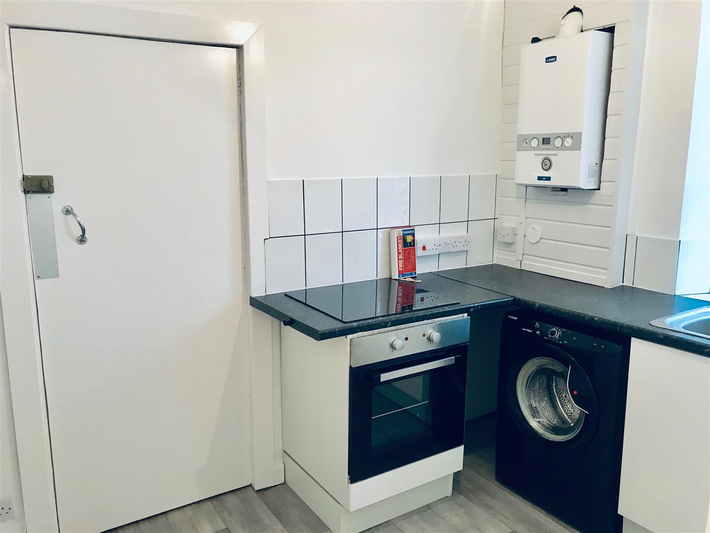 Kitchen - 3.23 x 2.15 at widest points (10'7" x 7'0" at wide - Range of base and eye-level units with work surfaces. Inset sink unit. Electric hob and oven. The washing machine in situ will be included within the tenancy. Wall-mounted gas boiler. Double-glazed window to the side elevation.