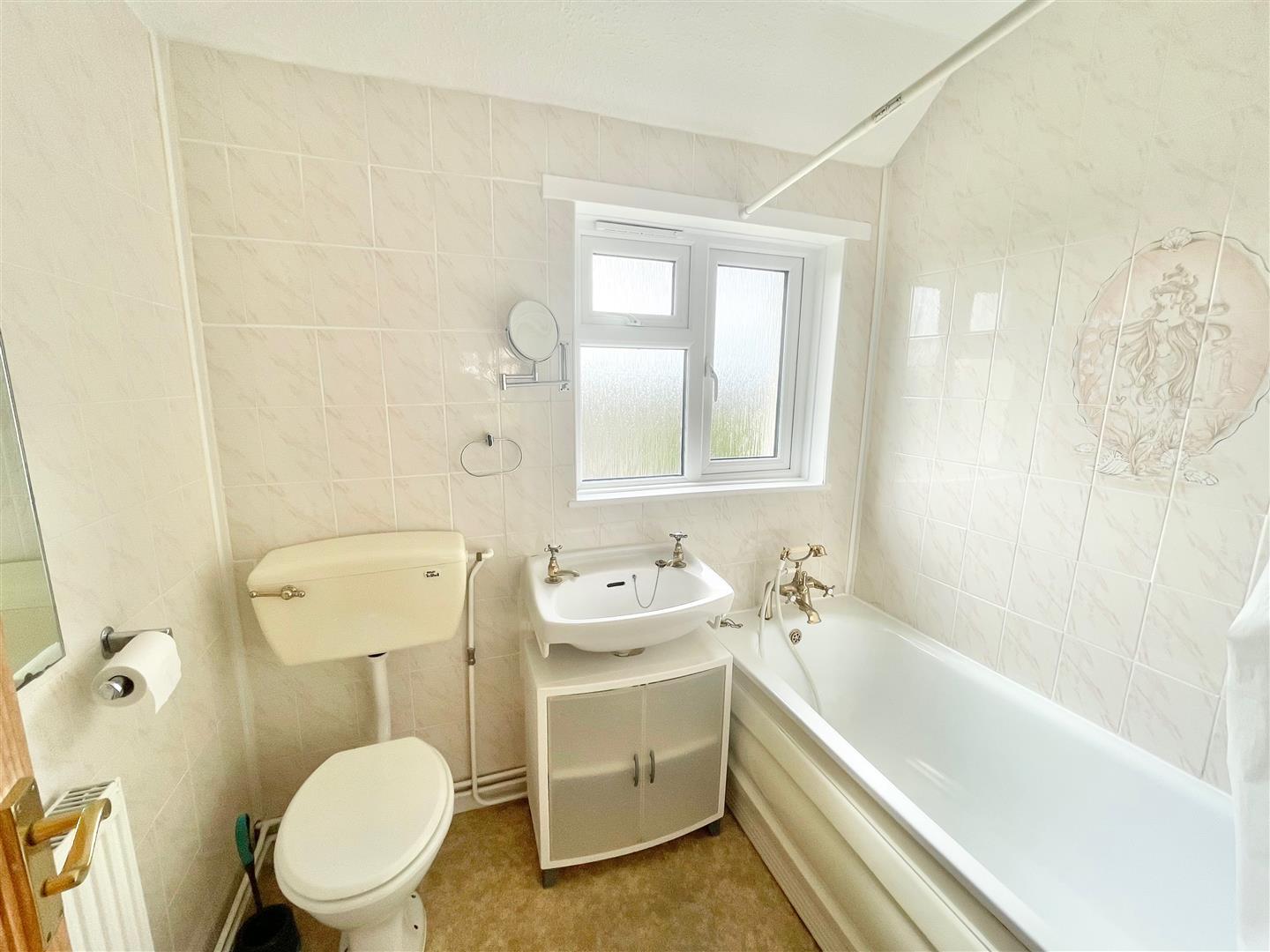 Bathroom - 2.09 x 1.68 (6'10" x 5'6") - Fitted with a white suite comprising panel bath with mixer tap, spray attachment and shower unit and spray attachment above the bath, sink unit and low-level toilet. Obscured double-glazed window to the rear. Fully-tiled walls.