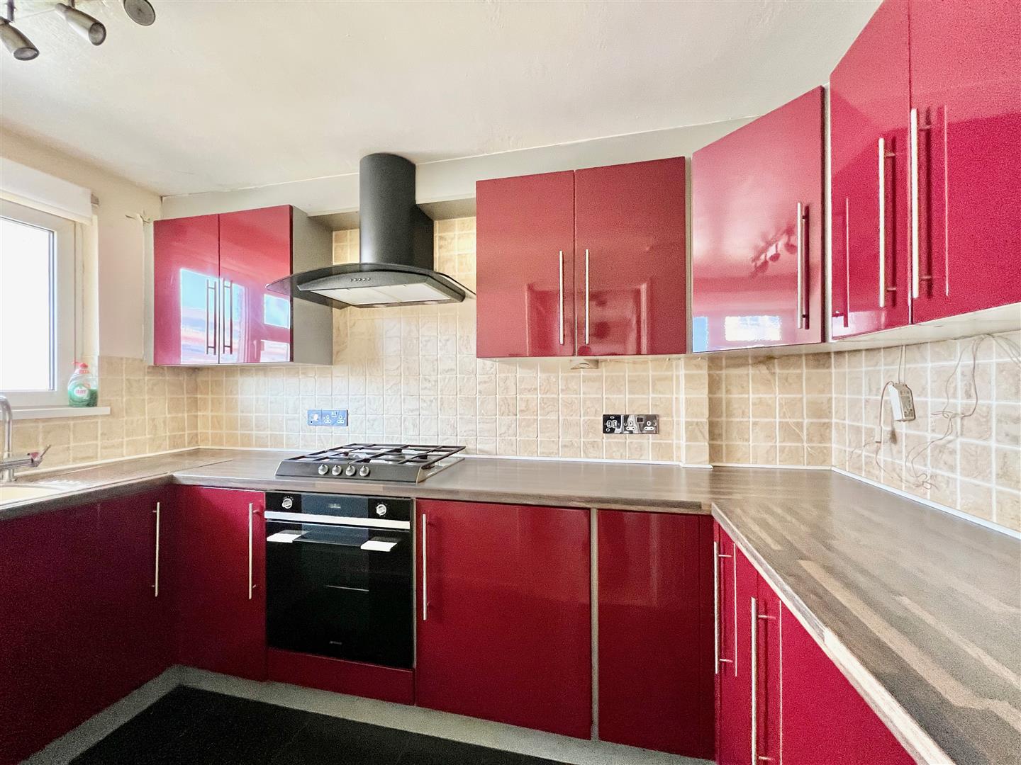 Kitchen - 3.15m x 1.68m (10'4" x 5'6") - Range of base and wall-mounted cabinets with matching fascias, work surfaces and tiled splash-backs. Integral fridge and freezer. Built-in oven and hob. Stainless-steel sink. Cooker hood. uPVC double-glazed window.
