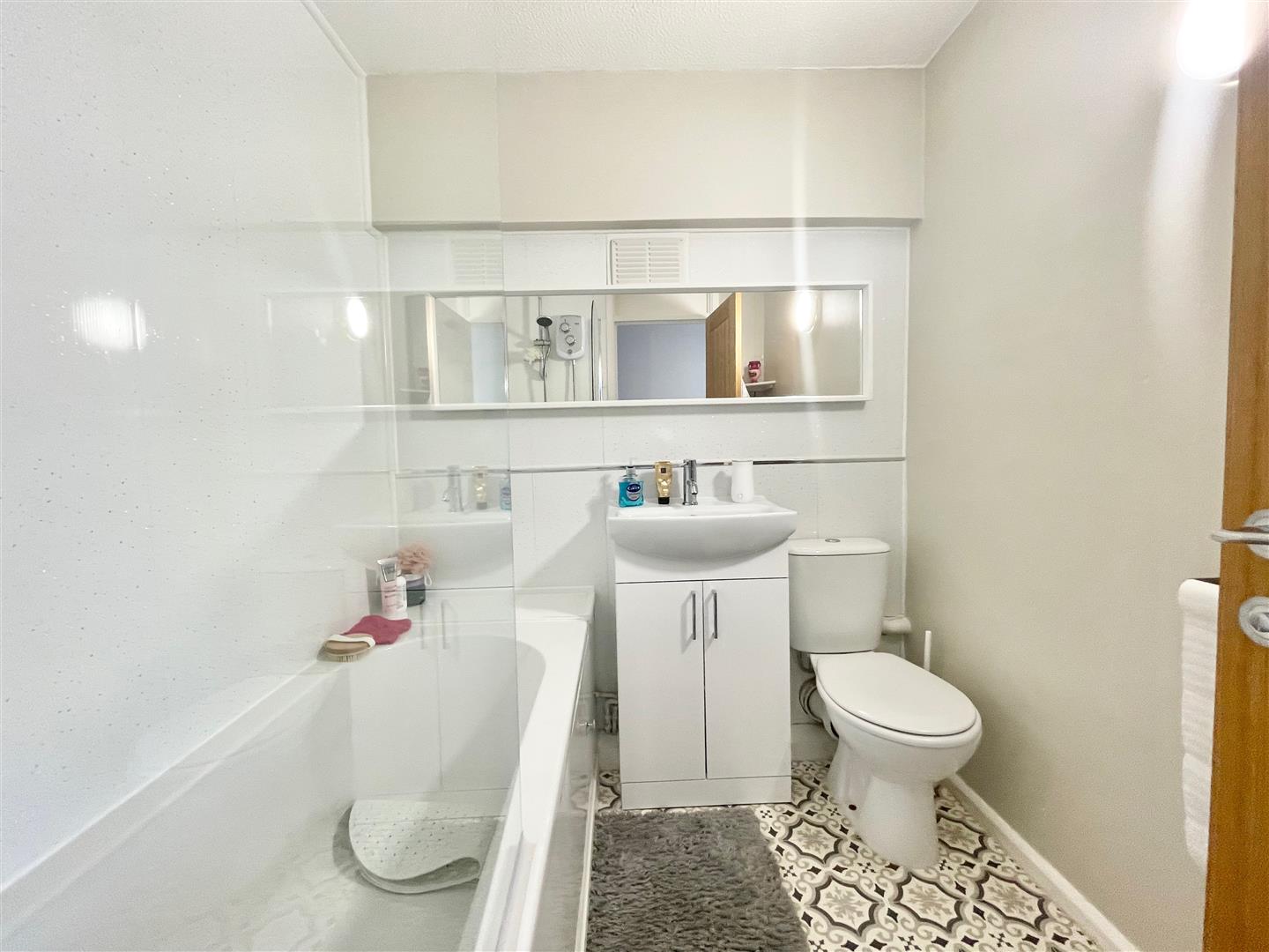 Bathroom - 1.93 x 1.82 (6'3" x 5'11") - White modern suite comprising a panel bath fitted with a shower unit and spray attachment over and a shower screen, low level toilet and sink unit. Built-in storage. Electric heater.