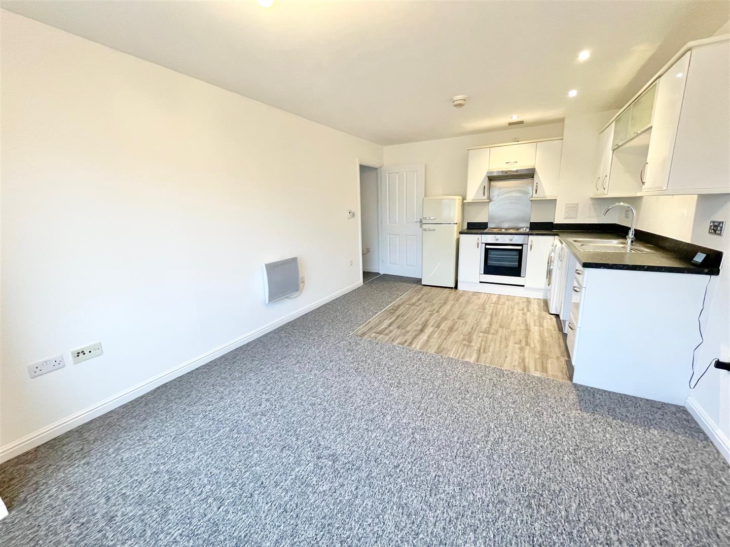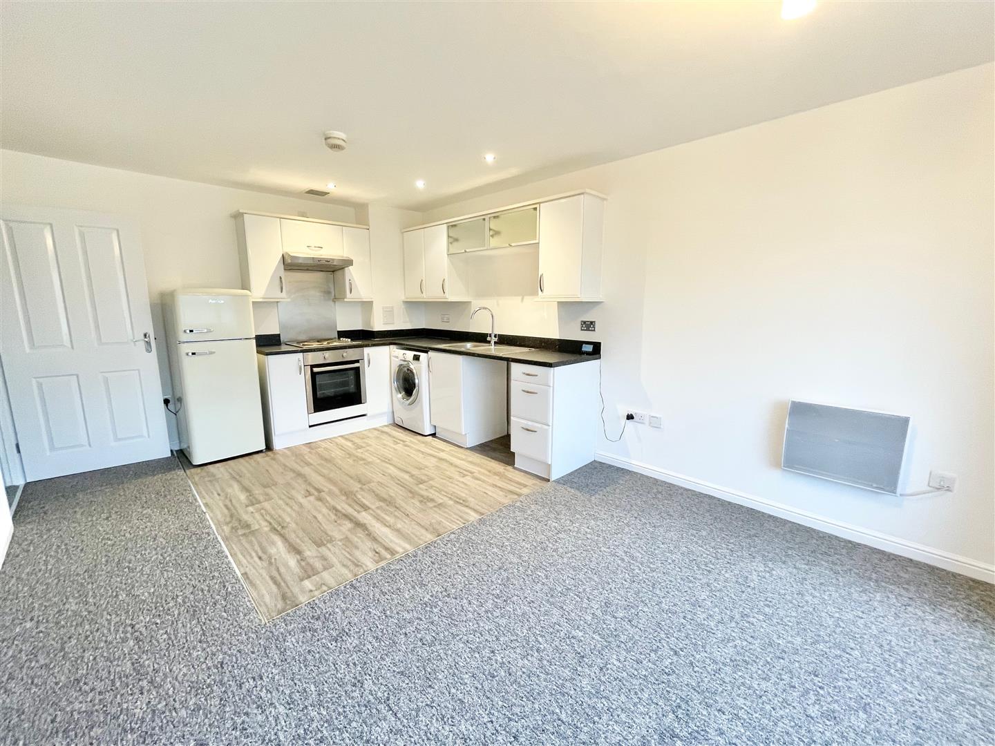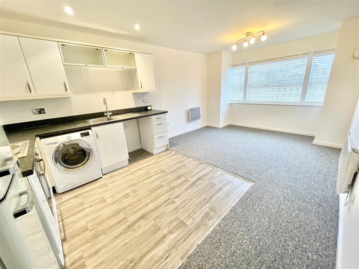 - Open-plan living/kitchen area with appliances