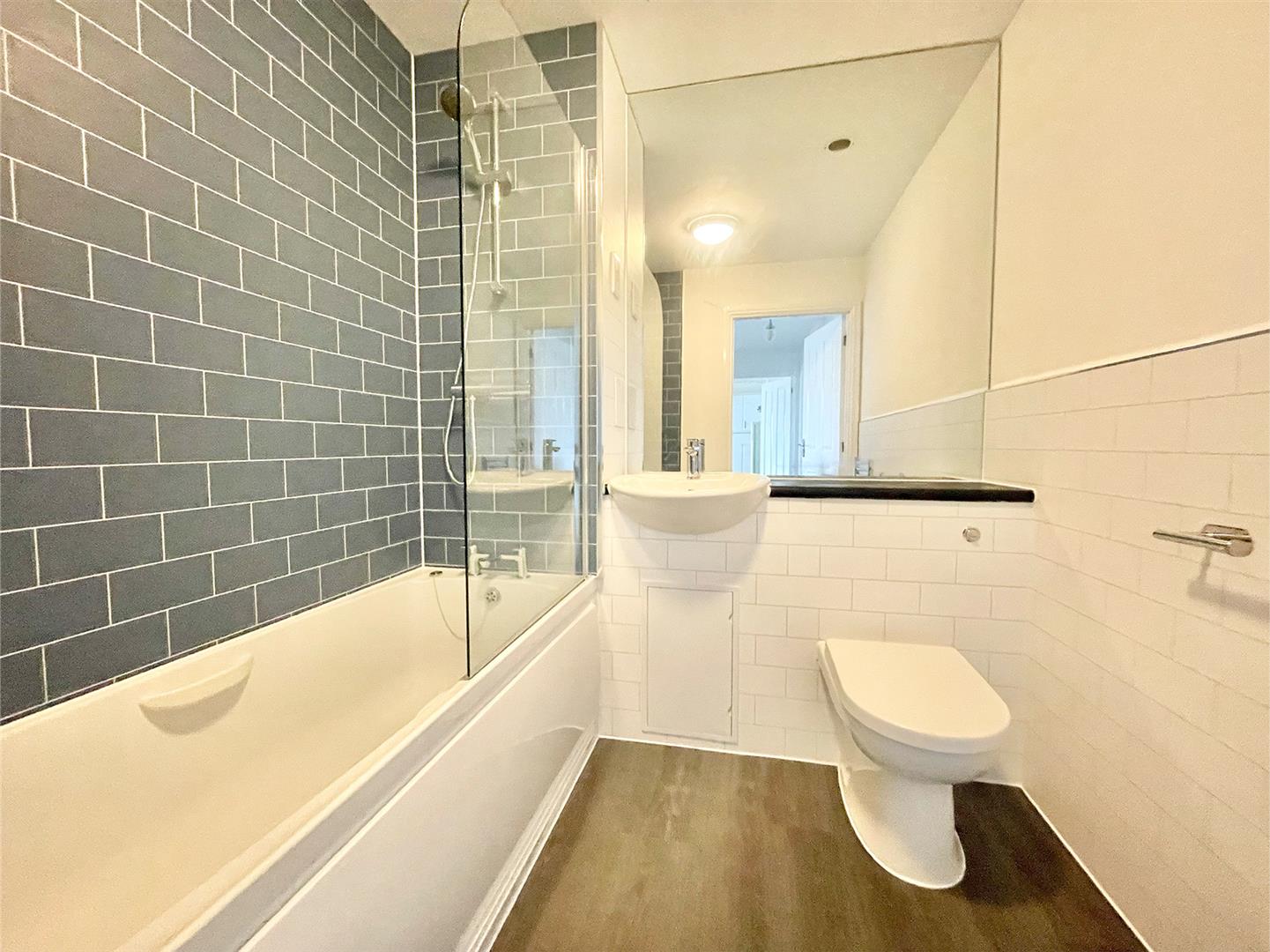 Bathroom - 2.01 x 1.98 (6'7" x 6'5") - White suite comprising a panel bath with mixer tap, shower unit with spray attachment, tiled area surround and shower screen, sink unit with mixer tap and low level toilet with boxed-in cistern. Built-in extractor fan. Wall-mounted electric heater/towel rail.