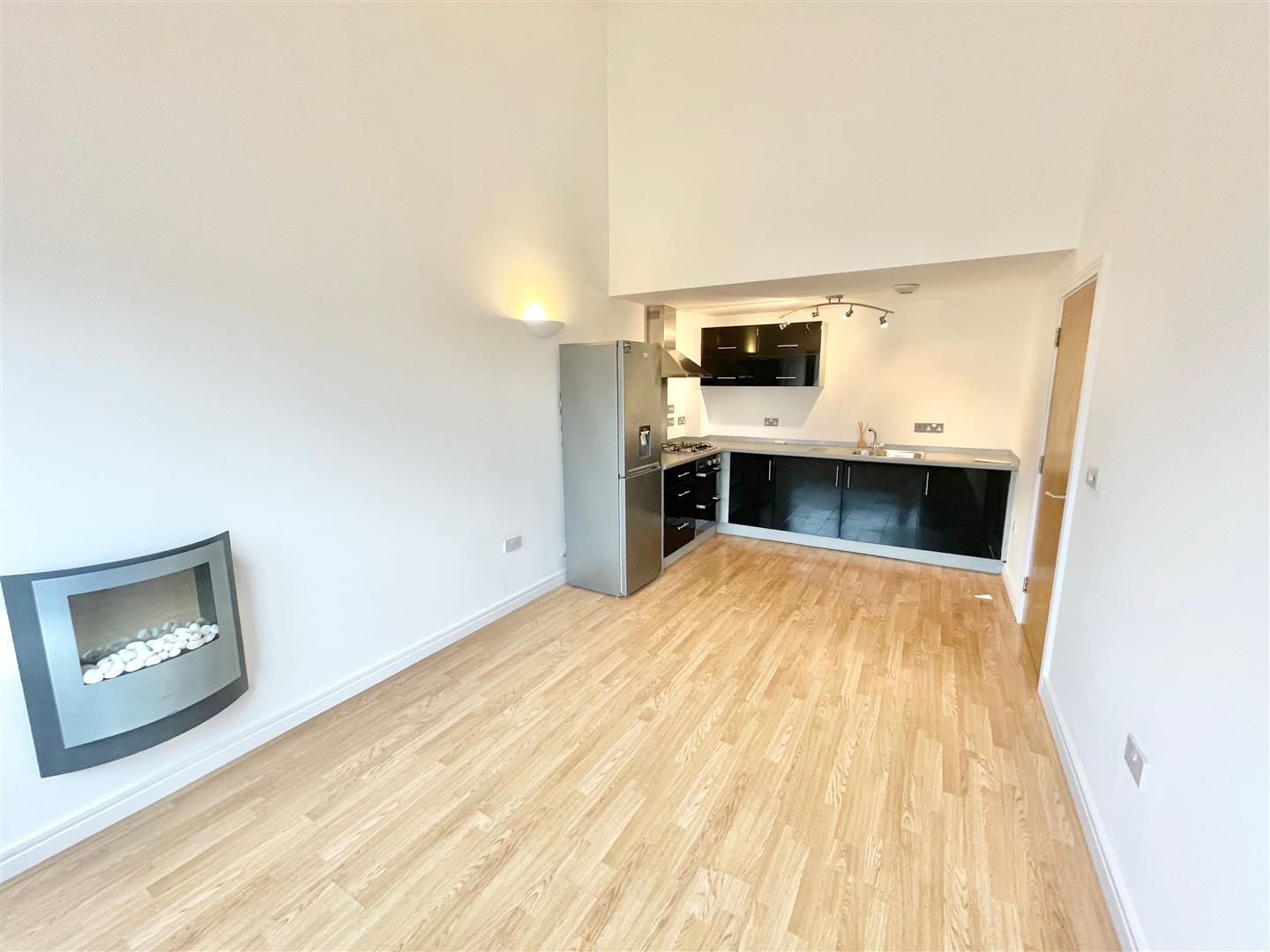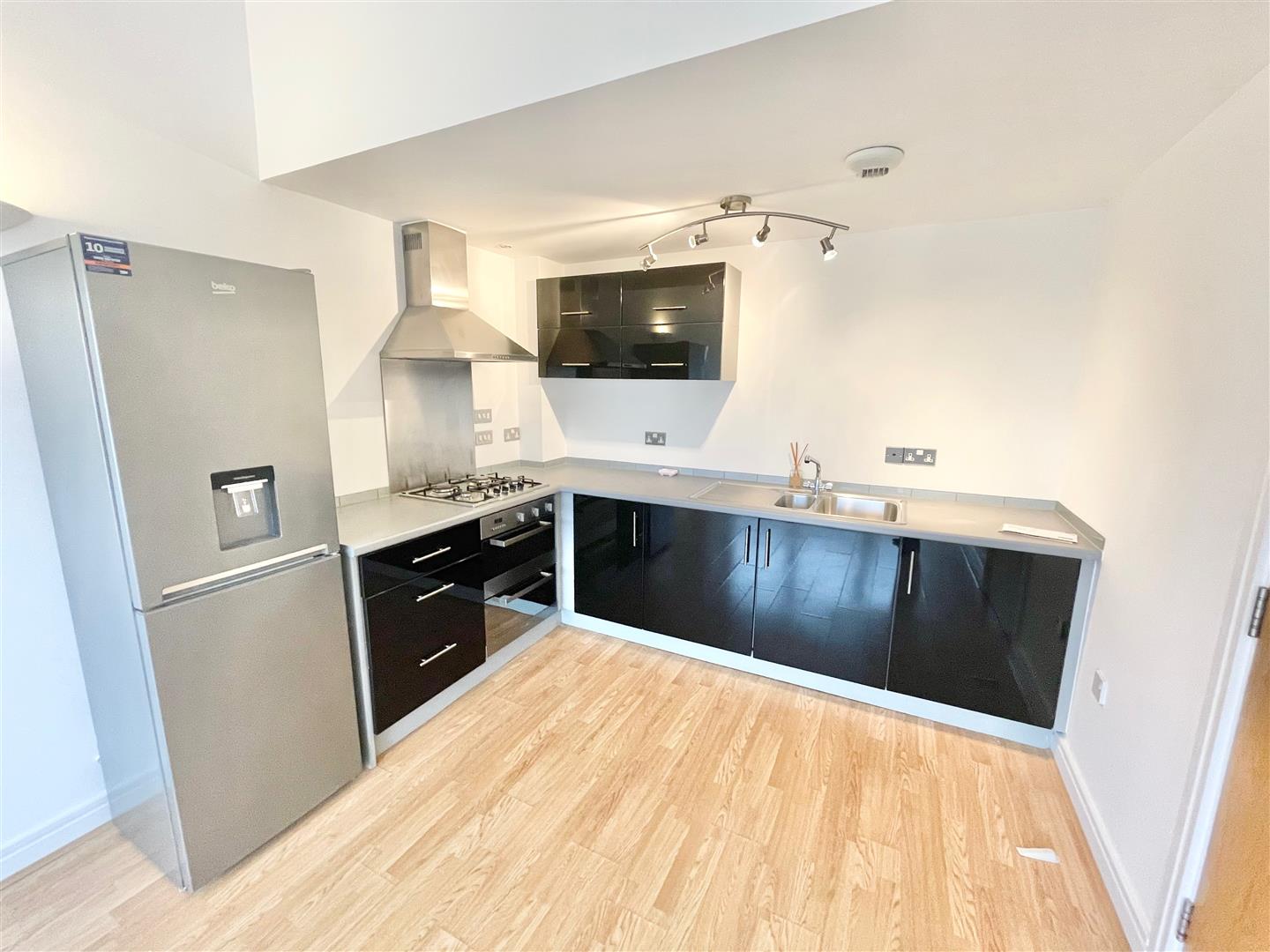 Open Plan Lounge/Diner/Kitchen - 6.16 x 2.96 (20'2" x 9'8") - A lovely light and airy, partly vaulted room with open plan living with matching base and wall mounted units with integrated twin oven, washer/dryer and the landlord will consider including a purchased fridge freezer. Roll edge laminate work surfaces have inset one and half bowl sink unit with mixer tap and four ring gas hob, stainless steel splash-back and stainless steel extractor hood. Space for sofas and a dining table. Wall mounted contemporary electric fan fire. Laminate wood flooring. Double glazed window to front.
