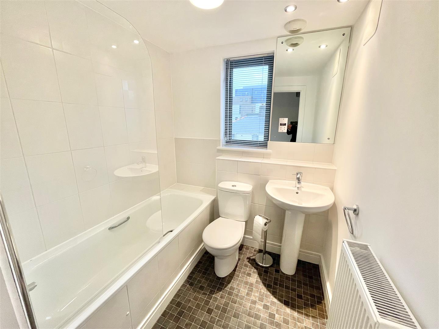 Bathroom - 1.89 x 1.89 (6'2" x 6'2") - Matching white suite of panelled bath with fitted shower over, pedestal wash hand basin and close coupled wc. Part titled walls. Fitted mirror with shaving point. Tiled effect vinyl flooring. Double glazed window to side. Ceiling spotlights. Extractor fan.