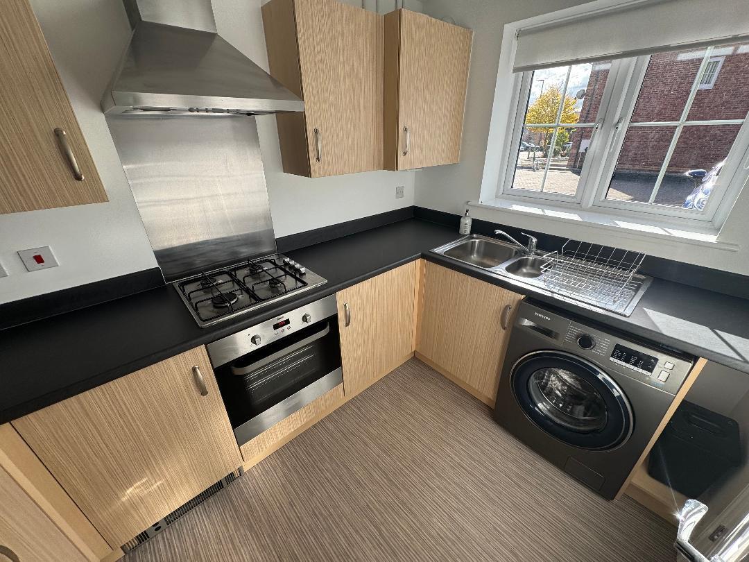 Kitchen - 2.10 x 2.10 (6'10" x 6'10") - The well-equipped kitchen features a range of wall and base units providing ample storage and workspace. It includes a built-in electric oven with a gas hob, along with a freestanding fridge freezer and washing machine for added convenience.