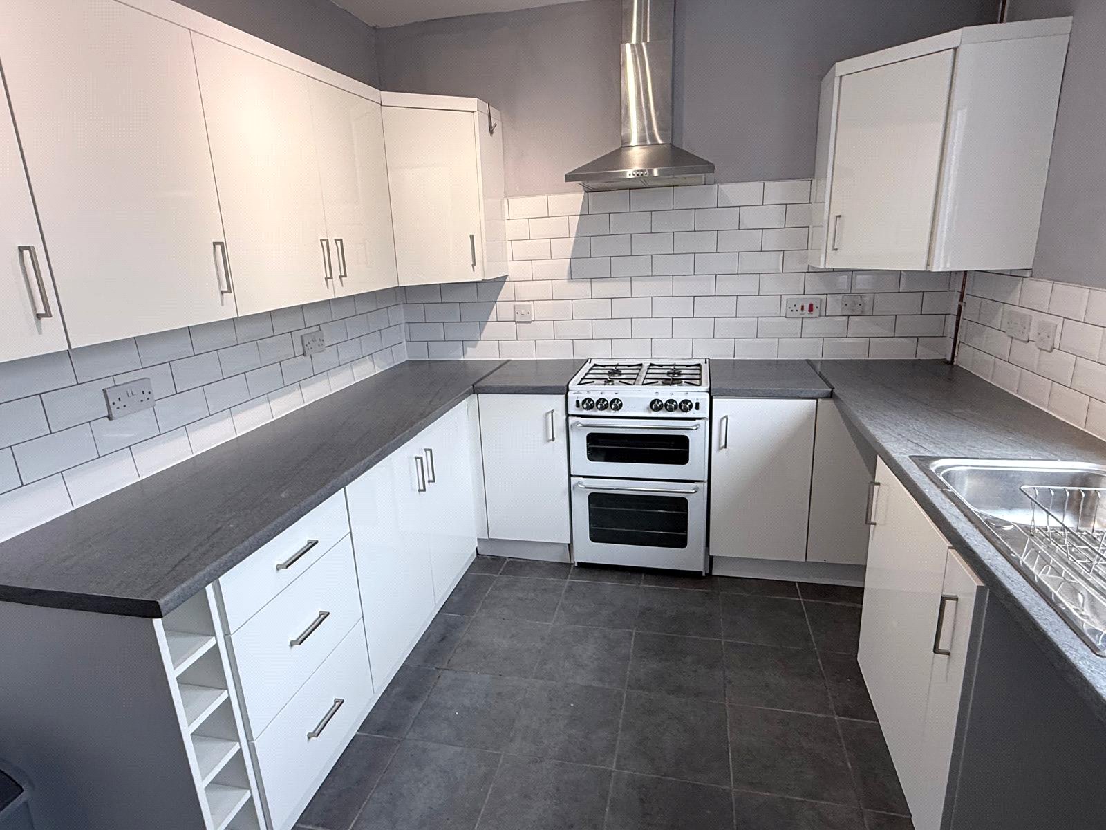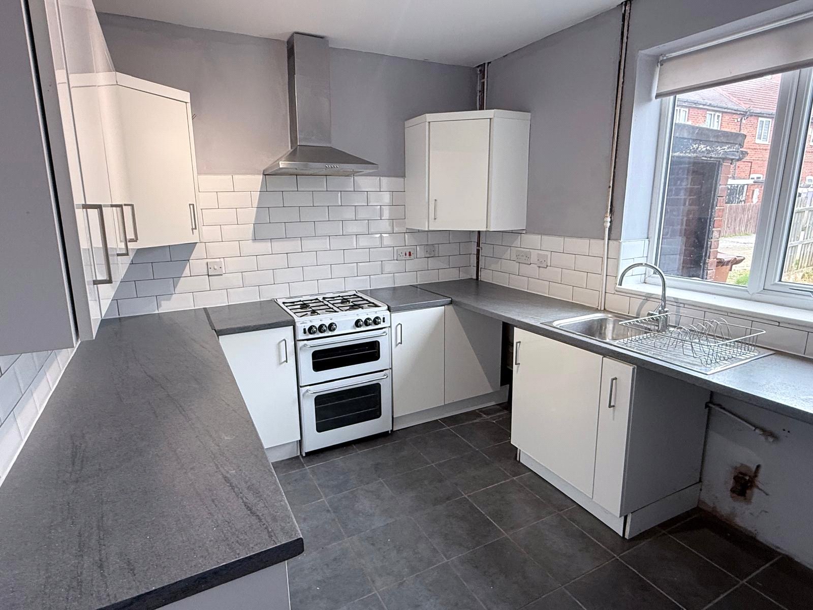 Kitchen 12'8" x 8'11" (3.86m x 2.72m). Fitted with a range of matching white fronted wall and base units, contrasting worksurfaces, splash back tiling, freestanding oven, grill and hob with extractor fan over, space and plumbing for automatic washing machine, stainless steel sink and drainer, double glazed window, rear entrance door leading to open rear yard and parking area.