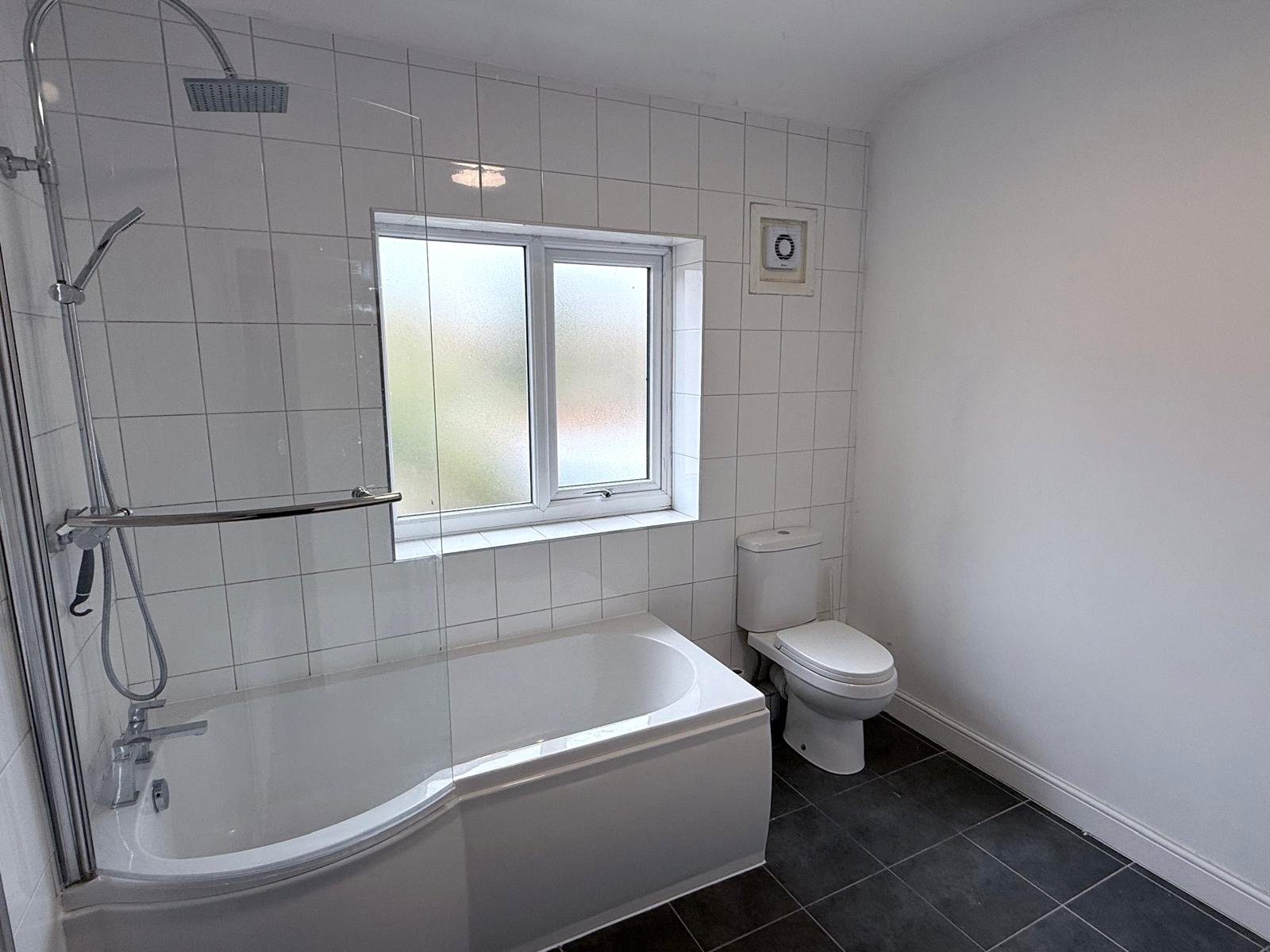 Bathroom Fitted with white suite comprising bath with shower over, low flush w.c, hand basin, frosted double glazed window, tiling to walls, extractor fan, central heating radiator