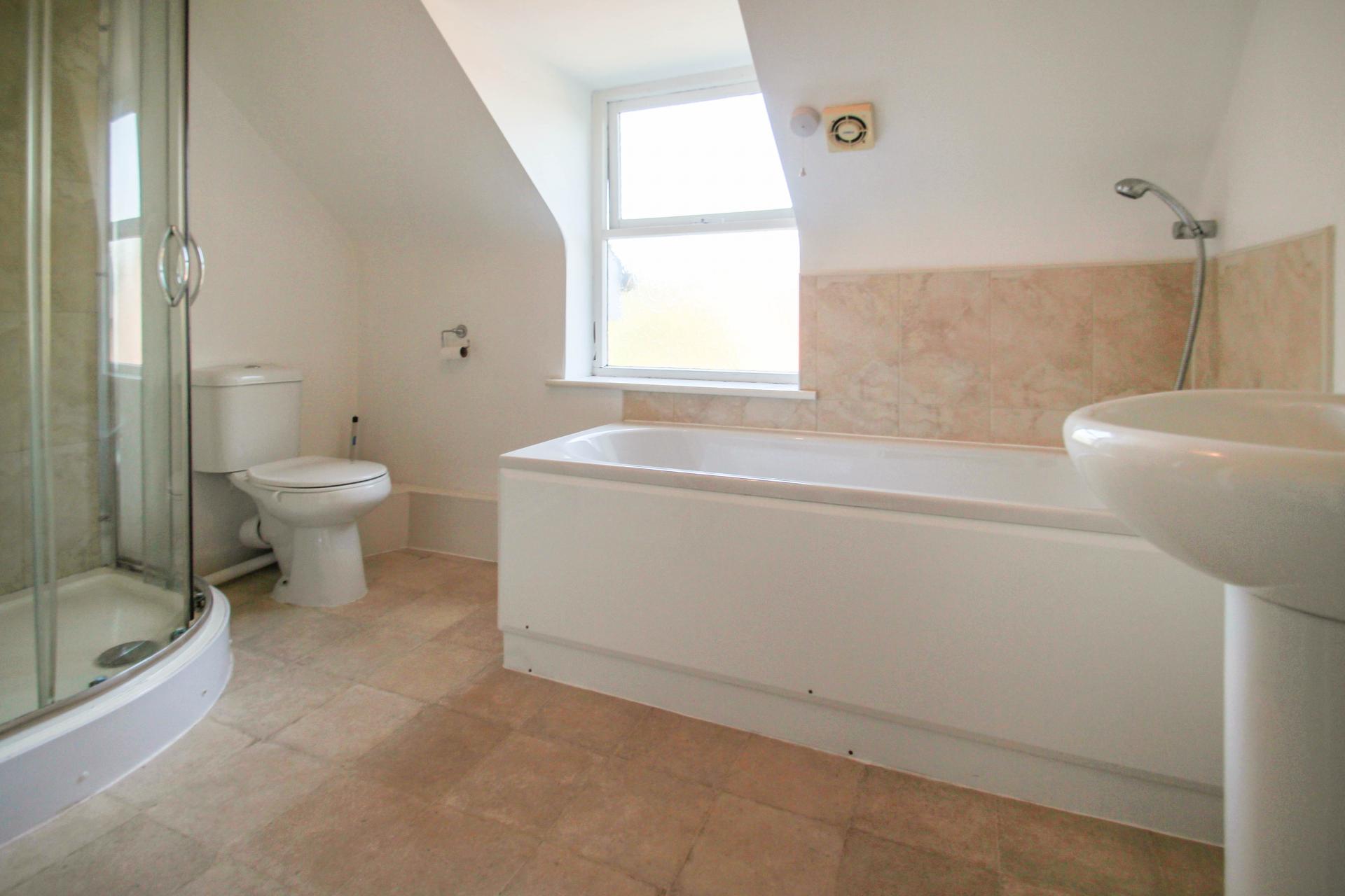 Smooth ceiling, double glazed obscure window, panel enclosed bath with shower off mixer taps, corner shower cubicle with plumbed shower over, low level wc, pedestal wash hand basin, towel rail.