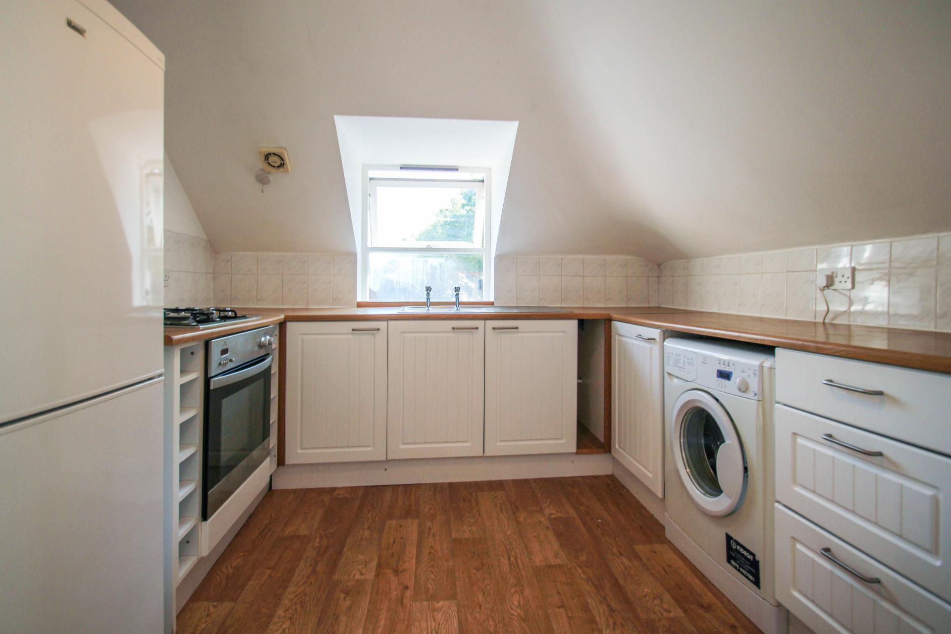Smooth ceiling, double glazed window, a range of base level units with roll edge work top over, dink and drainer, gas hob and electric oven, recesses for appliances.