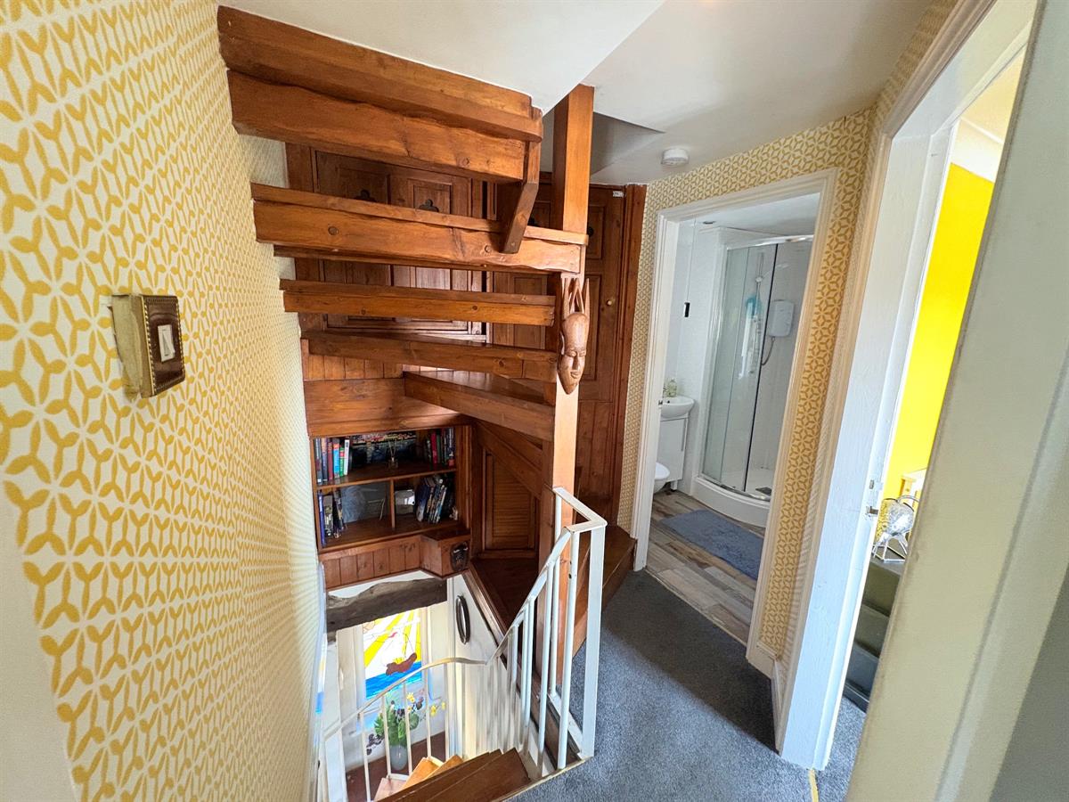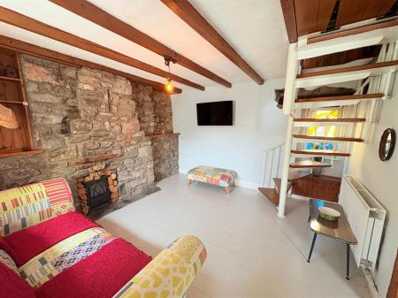 White painted floorboards, three white painted walls, one stone wall with a log burner, one window overlooking front, staircase leading upstairs, one white radiator.