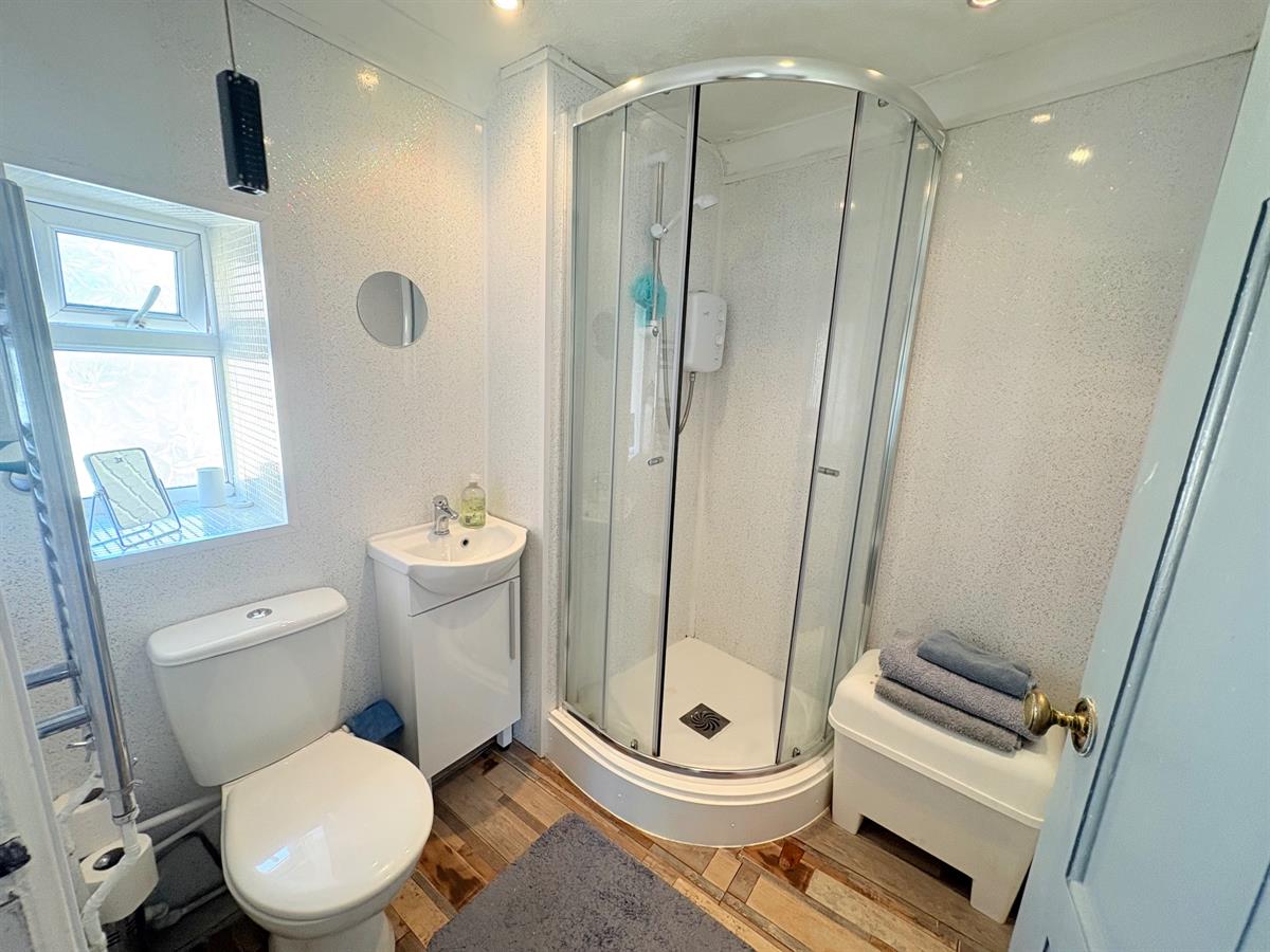 Wooden floorboards, white affect walls, white sink with silver tap, white toilet, white shower with glass sliding door, silver towel radiator, one window overlooking rear.