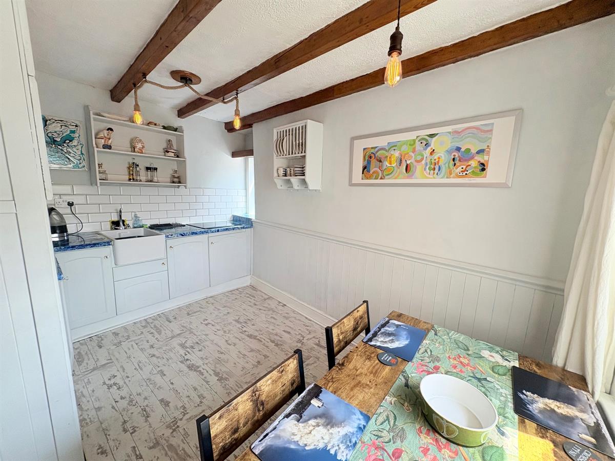 White wooden floorboards, white walls with white tiles surrounding appliances, integrated black hob, white sink with silver tap, one window overlooking front, white cupboards and shelving unit, blue worktop.