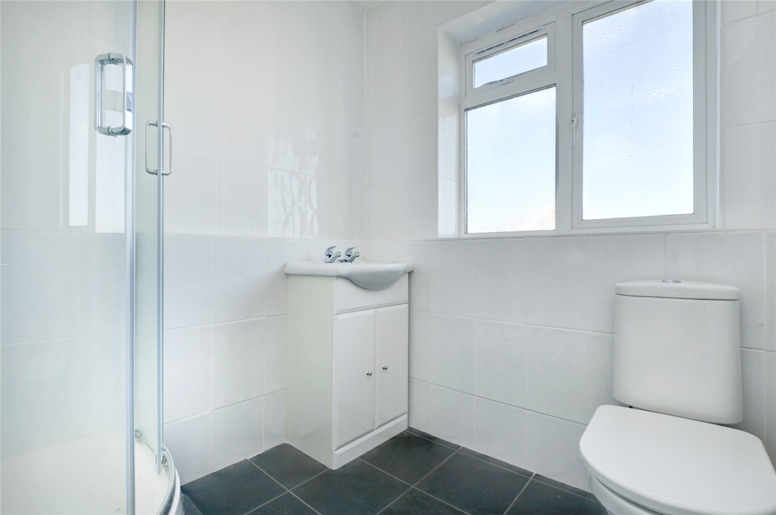 Across the hallway, the large double bedroom benefits from recessed built-in wardrobes, while the second bedroom offers ample space to relax. The attractive shower room features a corner shower with crisp white walls paired with contrasting black floor tiles. Deep hallway cupboards provide plenty of storage.