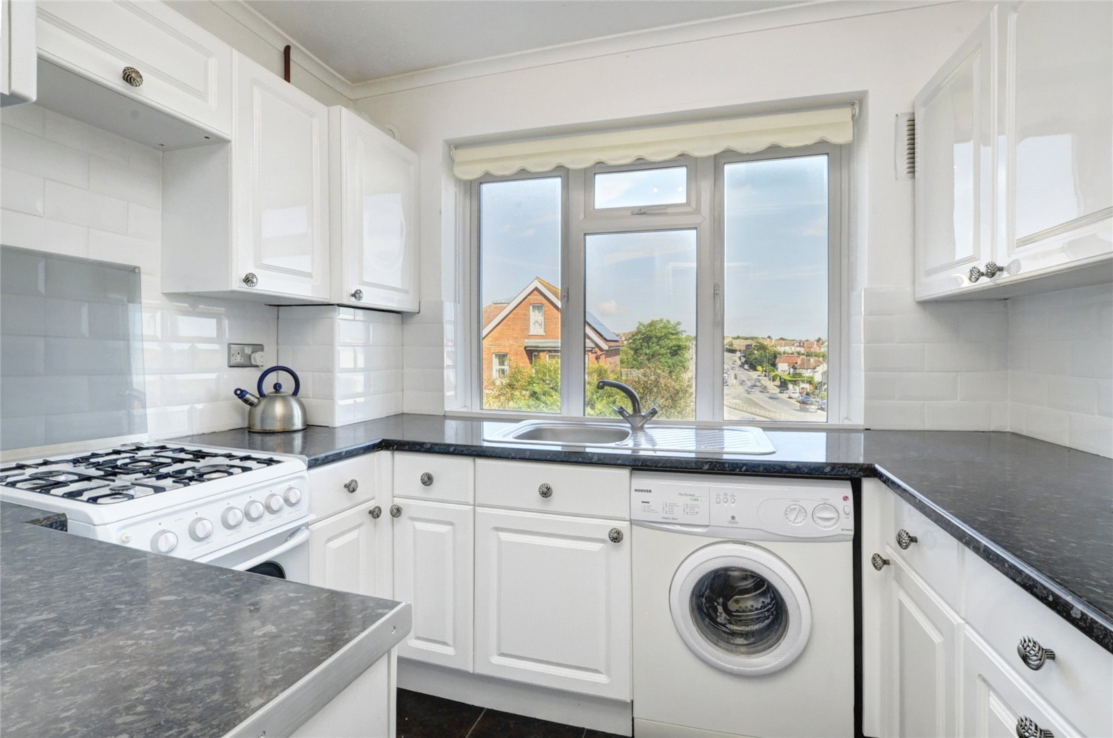 Fully fitted with Shaker-style cabinets and sleek black countertops, the modern kitchen is well-appointed with a range of appliances that includes a freestanding cooker, fridge-freezer and washing machine, and provides a lovely amount of storage and workspace.