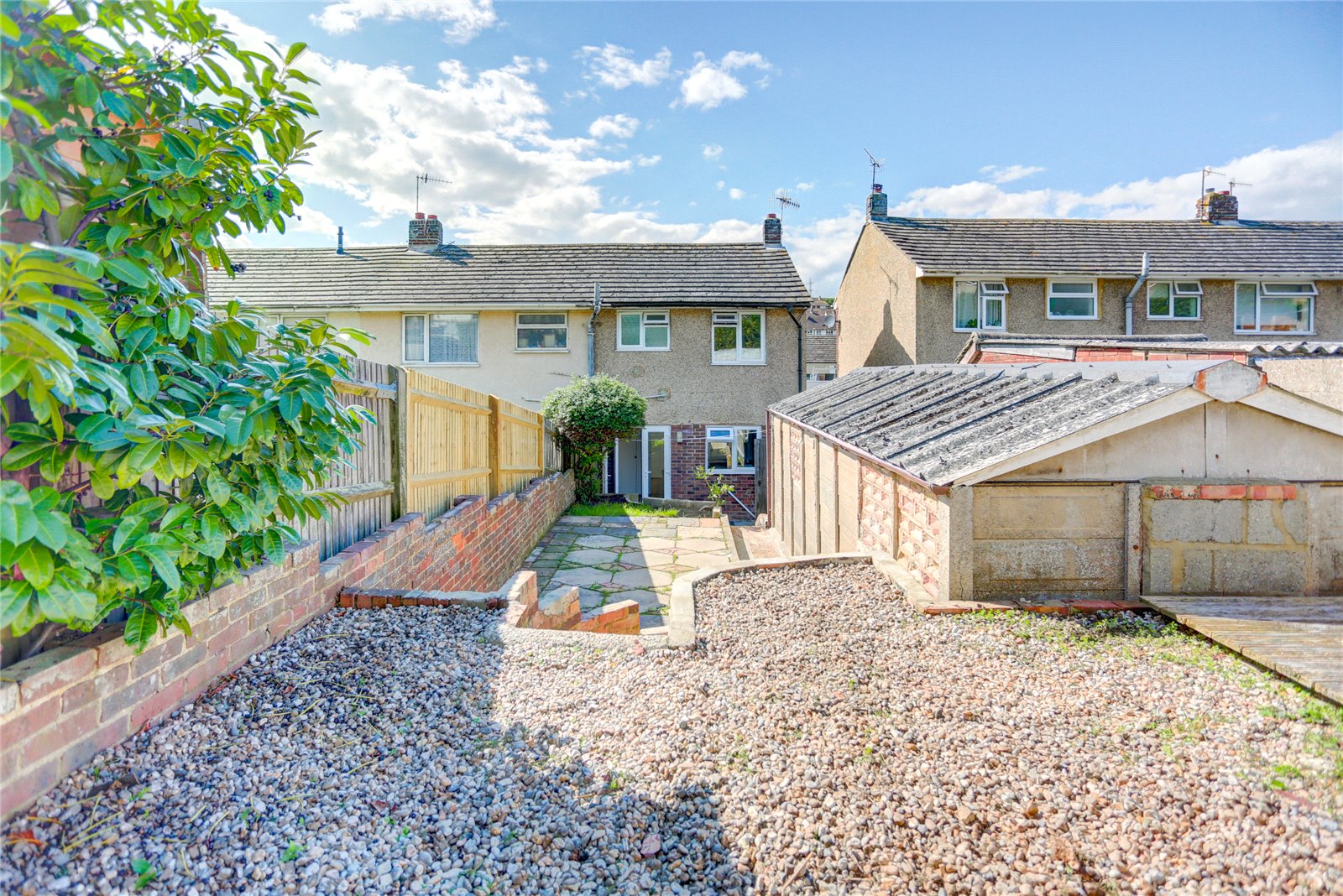 This two-bedroom terraced house features a spacious living and dining room on the ground floor, along with a separate kitchen equipped with an oven and hob. On the first floor, there are two double bedrooms and a modern fitted bathroom with a bath and overhead shower. The property also benefits from a private garden and a garage.